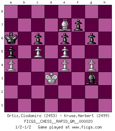 Last move : 1/2-1/2 2023 June 1 22:4:24 [Event "FICGS__CHESS__RAPID_GM__000020"] [Site "FICGS"] [Date "2023.04.08"] [Round "1"] [White "Ortiz,Clodomiro"] [Black "Kruse,Herbert"] [Result "1/2-1/2"] [WhiteElo "2453"] [BlackElo "2499"] 1.d4 Nf6 2.Nf3 e6 3.e3 b6 4.Bd3 Bb7 5.O-O d5 6.b3 Be7 7.Bb2 O-O 8.Nbd2 Nbd7 9.Ne5 Nxe5 10.dxe5 Ne4 11.Nxe4 dxe4 12.Be2 h6 13.a4 a5 14.h3 Qxd1 15.Raxd1 Rad8 16.g4 g6 17.Kg2 Kg7 18.f4 exf3+ 19.Bxf3 Bxf3+ 20.Kxf3 Rh8 21.Rxd8 Rxd8 22.Ke2 Bb4 23.Rd1 Rxd1 24.Kxd1 h5 25.e4 hxg4 26.hxg4 Be7 27.Bc1 Kf8 28.Ke2 Ke8 29.Kd3 Kd7 30.Kc4 Kc6 31.Be3 Bh4 32.Bf4 Be7 33.Be3 Bh4 34.Bf4 Bf2 35.c3 Kb7 36.Bg5 Bg3 37.Bf6 c6 38.Kd3 Bf4 39.Kd4 Ka6 40.Kd3 Bg3 41.Kc4 Bf4 42.Kd3 Bg3 43.Kc4 Bf2 44.Kd3 Bg1 45.Bg5 Ka7 46.Kc4 Ka6 47.Kd3 b5 48.c4 bxa4 49.bxa4 Bc5 50.Bf6 Bb4 51.Bg5 Bc5 52.Bh4 Bb6 53.Be7 Bf2 54.c5 Bg3 1/2-1/2 Follow this game move after move (download)Nonsense was the last thing Fischer was interested in, as far as Chess was concerned. (Elie Agur) Sie führen leise Selbstgespräche, schlürfen lautstark ihre Getränke, schmatzen hörbar beim Essen, blasen ihrem Gegenüber Rauch in die Augen, niesen ihm ins Gesicht, starren ihn unverwandt an, bis er sich unter ihren Blicken windet, rutschen ständig auf ihrem Stuhl hin und her, rülpsen und bohren in der Nase. (Anonymous) Dios mío, Bobby Fischer juega tan simple. (Alexei Suetin) Les Echecs sont affaire de jugement sensible. Savoir quand frapper et quand esquiver. (Fischer) Drag your thoughts away from your troubles... by the ears, by the heels, or any other way you can manage it. (Mark Twain)