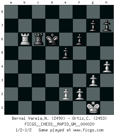 Last move : 1/2-1/2 2023 May 7 6:5:48 [Event "FICGS__CHESS__RAPID_GM__000020"] [Site "FICGS"] [Date "2023.04.08"] [Round "1"] [White "Bernal Varela,Nelson"] [Black "Ortiz,Clodomiro"] [Result "1/2-1/2"] [WhiteElo "2490"] [BlackElo "2453"] 1.Nf3 Nf6 2.c4 c5 3.Nc3 Nc6 4.g3 d5 5.d4 e6 6.cxd5 Nxd5 7.Bg2 cxd4 8.Nxd4 Nxc3 9.bxc3 Nxd4 10.Qxd4 Qxd4 11.cxd4 Bd6 12.O-O Rb8 13.a4 Bd7 14.a5 Ke7 15.Bg5+ f6 16.Be3 b6 17.h4 Rhc8 18.d5 e5 19.Rfb1 Bc5 20.axb6 axb6 21.Bxc5+ Rxc5 22.d6+ Kd8 23.Ra7 b5 24.Bb7 Rc4 25.Rba1 b4 26.Ra8 Rxa8 27.Rxa8+ Bc8 28.Rb8 Kd7 29.Bxc8+ Rxc8 30.Rxb4 Kxd6 31.Rb6+ Rc6 1/2-1/2 Follow this game move after move (download)One bad move nullifies forty good ones. (Horowitz) Sitze auf Deine Hände. (Siegbert Tarrasch) Un Peón pasado aumenta su poder a medida de que el número de piezas en el tablero disminuye. (Capablanca) Les échecs, c'est la lutte contre l'erreur. (Johannes Zukertort) If you ain't just a little scared when you enter a casino, you are either very rich or you haven't studied the games enough. (Pappy)