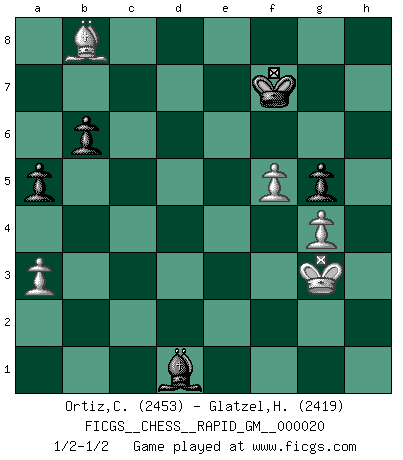Last move : 1/2-1/2 2023 June 5 12:58:7 [Event "FICGS__CHESS__RAPID_GM__000020"] [Site "FICGS"] [Date "2023.04.08"] [Round "1"] [White "Ortiz,Clodomiro"] [Black "Glatzel,Hans Joachim"] [Result "1/2-1/2"] [WhiteElo "2453"] [BlackElo "2419"] 1.d4 Nf6 2.c4 e6 3.Nc3 Bb4 4.e3 O-O 5.Nf3 d5 6.a3 Bxc3+ 7.bxc3 c5 8.Be2 Qc7 9.cxd5 exd5 10.dxc5 Qxc5 11.O-O Rd8 12.c4 Nc6 13.Qa4 dxc4 14.Qxc4 Qxc4 15.Bxc4 Ne4 16.Bb2 Bg4 17.Rfe1 Nc5 18.Rad1 Rac8 19.Rxd8+ Rxd8 20.Bc3 Be6 21.Be2 b6 22.Bb5 Rc8 23.Rc1 f6 24.Bb2 Kf7 25.h4 Bd7 26.Bf1 h6 27.Nd4 Nxd4 28.Bxd4 Ne4 29.Rxc8 Bxc8 30.Bd3 Nd6 31.e4 Be6 32.f4 Bb3 33.Kf2 Nc4 34.Bxc4+ Bxc4 35.g4 Bb3 36.f5 Bd1 37.Kg3 Bc2 38.Kf4 g6 39.Be3 g5+ 40.hxg5 hxg5+ 41.Kf3 Ba4 42.Ke2 Bb5+ 43.Kf2 Bd3 44.e5 Bc2 45.Ke1 Bb3 46.Bd4 fxe5 47.Bxe5 Bd5 48.Kf2 Bb3 49.Bb8 Bd1 50.Kg3 a5 1/2-1/2 Follow this game move after move (download)You must take your opponent into a deep dark forest where 2+2=5, and the path leading out is only wide enough for one. (Mikhail Tal) Ich tröste mich mit dem Vergnügen, daß Schachfans, Zuschauer und Leser glücklich sind, wenn ein Großmeister etwas riskiert, statt nur Klötzchen zu schieben. (Mikhail Nekhemyevich Tal) Solo puedes ser bueno en el Ajedrez si amas al juego. (Bobby Fischer) La vie et les Echecs sont tous les deux une lutte constante. (Lasker) All art requires courage. (Anne Tucker)
