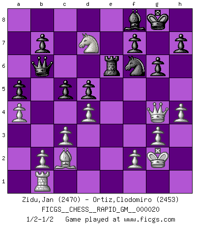 Last move : 1/2-1/2 2023 May 27 17:28:37 [Event "FICGS__CHESS__RAPID_GM__000020"] [Site "FICGS"] [Date "2023.04.08"] [Round "1"] [White "Zidu,Jan"] [Black "Ortiz,Clodomiro"] [Result "1/2-1/2"] [WhiteElo "2470"] [BlackElo "2453"] 1.e4 e5 2.Nf3 Nc6 3.Bb5 Nf6 4.O-O Nxe4 5.Re1 Nd6 6.Nxe5 Be7 7.Bf1 Nxe5 8.Rxe5 O-O 9.d4 Bf6 10.Re1 Re8 11.c3 Rxe1 12.Qxe1 Ne8 13.Bf4 d5 14.Nd2 c6 15.a4 a5 16.Bd3 g6 17.Nf3 Ng7 18.Bh6 Be7 19.Qe5 Bf8 20.Qe3 Qb6 21.Rb1 Bg4 22.h3 Re8 23.Qf4 Ne6 24.Qxg4 Bxh6 25.h4 Nf4 26.Bc2 Nh5 27.Ne5 Bf8 28.g3 Re6 29.Kg2 c5 30.Nd7 Nf6 1/2-1/2 Follow this game move after move (download)Chess is a sea in which a gnat may drink and an elephant may bathe. (Hindu proverb) Sicherlich können nur Meister einen Stil haben. Daß ein nicht-Meister auch nur ein einziges Mal in seinem Leben eine Partie folgerecht durchführte, habe ich niemals bemerkt. (Emanuel Lasker) Los problemas de Ajedrez exigen del compositor las mismas virtudes que caracterizan todo el arte de valor: originalidad, invención, concisión, armonía, complejidad e insinceridad explendida. (Vladimir Nabokov) Un footballeur joue avec ses pieds, parfois avec sa tête. Un joueur d'échecs ne joue qu'avec sa tête. Et quand il ne joue plus, il meurt. (Jacob Murray) A bird doesn't sing because it has an answer, it sings because it has a song. (Maya Angelou)