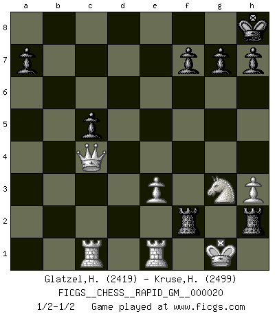 Last move : 1/2-1/2 2023 June 1 22:19:5 [Event "FICGS__CHESS__RAPID_GM__000020"] [Site "FICGS"] [Date "2023.04.08"] [Round "1"] [White "Glatzel,Hans Joachim"] [Black "Kruse,Herbert"] [Result "1/2-1/2"] [WhiteElo "2419"] [BlackElo "2499"] 1.d4 Nf6 2.c4 e6 3.Nc3 Bb4 4.e3 O-O 5.Bd3 d5 6.Nf3 c5 7.O-O b6 8.cxd5 exd5 9.Ne5 Bxc3 10.bxc3 Ba6 11.Re1 Bxd3 12.Nxd3 Qc7 13.dxc5 bxc5 14.Nf4 Rd8 15.c4 dxc4 16.Qc2 Nbd7 17.Bb2 Rab8 18.Rac1 Qc6 19.Bxf6 Nxf6 20.Qxc4 Rd2 21.h3 R8b2 22.Nd3 Rxa2 23.Nb4 Rxf2 24.Nxc6 Rxg2+ 25.Kh1 Rh2+ 26.Kg1 Rhg2+ 27.Kh1 Rh2+ 28.Kg1 Rag2+ 29.Kf1 Rf2+ 30.Kg1 Rhg2+ 31.Kh1 Rh2+ 32.Kg1 Rfg2+ 33.Kf1 Nh5 34.Ne7+ Kh8 35.Nf5 Rf2+ 36.Kg1 Rhg2+ 37.Kh1 Rh2+ 38.Kg1 Rhg2+ 39.Kh1 Ng3+ 40.Nxg3 Rh2+ 41.Kg1 1/2-1/2 Follow this game move after move (download)Morphy was probably the greatest genius of them all. (Bobby Fischer) Schach verlangt totale Konzentration. (Robert James Fischer) Hoy en día, si tu no eres un Gran Maestro a los 14 años, es mejor que lo olvides. (Anand Viswanathan) Je fais ceci parce que dans cinquante coups j'obtiendrai cela; je m'appelle Mikhail Moisevitch Botvinnik. (Botvinnik) Now the reason the enlightened prince and the wise general conquer the enemy whenever they move and their achievements surpass those of ordinary men is foreknowledge. (Sun Tzu)