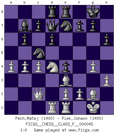 Last move : 1-0 2008 May 8 21:28:41 [Event "FICGS__CHESS__CLASS_F__000045"] [Site "FICGS"] [Date "2007.08.27"] [Round "1"] [White "Pech,Matej"] [Black "Piek,Johann"] [Result "1-0"] [WhiteElo "1400"] [BlackElo "1400"] 1.c4 Nf6 2.Nc3 e5 3.Nf3 Nc6 4.g3 Bb4 5.Bg2 O-O 6.O-O e4 7.Ne1 Bxc3 8.dxc3 d6 9.Nc2 Ne5 10.b3 Re8 11.h3 Bd7 12.Bg5 h6 13.Be3 Qc8 14.Kh2 a5 15.a4 Bc6 16.Nd4 b6 17.Qc2 Bb7 18.Rad1 Rb8 19.Qc1 Nfd7 20.Qb1 Nc5 21.Qc2 Qd7 22.g4 Nc6 23.Kg1 Ne7 24.Rfe1 Rbd8 25.b4 axb4 26.cxb4 1-0 English Opening Kingside Castling by player Black (move 5) Kingside Castling by player White (move 6) Player White won this chess game. Follow this game move after move (download)A good sacrifice is one that is not necessarily sound but leaves your opponent dazed and confused. (Rudolph Spielmann) Es gibt Leute, die glauben, alles wäre vernünftig, was man mit einem ernsthaften Gesicht tut. (Georg Christoph Lichtenberg) El sobresalir en el Ajedrez es un signo de una mente intrigante. (Sir Arthur Conan Doyle) Les échecs sont utiles à l'exercice de la faculté de penser et à celle de l'imagination. Car nous devons posséder une méthode élaborée pour atteindre des buts partout où nous devons conduire notre raison. (Leibnitz) The ego is not master in its own house. (Sigmund Freud)