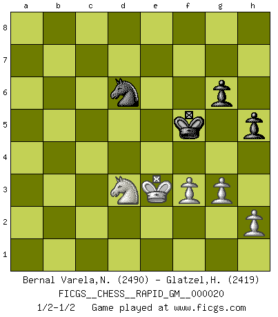 Last move : 1/2-1/2 2023 July 12 20:35:40 [Event "FICGS__CHESS__RAPID_GM__000020"] [Site "FICGS"] [Date "2023.04.08"] [Round "1"] [White "Bernal Varela,Nelson"] [Black "Glatzel,Hans Joachim"] [Result "1/2-1/2"] [WhiteElo "2490"] [BlackElo "2419"] 1.e4 e5 2.Nf3 Nc6 3.Bb5 a6 4.Ba4 Nf6 5.O-O b5 6.Bb3 Bb7 7.Re1 Bc5 8.c3 d6 9.d4 Bb6 10.a4 h6 11.Be3 Ng4 12.Bd5 Qc8 13.axb5 axb5 14.Rxa8 Qxa8 15.Na3 Nxe3 16.Rxe3 b4 17.Nc4 bxc3 18.Rxc3 O-O 19.dxe5 Nxe5 20.Nxb6 cxb6 21.Bxb7 Qxb7 22.Qxd6 Re8 23.Nd2 Qa8 24.Rc1 Qd8 25.Qxd8 Rxd8 26.Rc2 Nc4 27.Nf1 b5 28.b3 Na5 29.Rc5 Nxb3 30.Rxb5 Nd4 31.Rb2 f5 32.exf5 Nxf5 33.g3 Ra8 34.Rd2 Ra4 35.Kg2 h5 36.Rd5 g6 37.Nd2 Rd4 38.Rxd4 Nxd4 39.Nf3 Ne6 40.Ne5 Kg7 41.Nc6 Kf6 42.f3 Nc7 43.Nb4 Ke5 44.Kf2 Nb5 45.Nd3+ Kf6 46.Ke3 Nd6 47.Nb2 Ke5 48.Nd3+ Kf5 1/2-1/2 Follow this game move after move (download)The hardest game to win is a won game. (Emanuel Lasker) Karpov ist ein Museumsstück. (Garry Kasparov) Si tu oponente no puede hacer nada activo, entonces no apures la posición; En vez de eso, dejalo estar sentado ahí, sufriendo y rogandote por un empate. (Jeremy Silman) Echiquier : carré parfait, comme la Jérusalem nouvelle décrite par l'auteur de l'Apocalypse, huit cases sur huit, exaltation du chiffre 4, symbole du cosmos aux quatre horizons... où le noir et le blanc, l'ombre et la lumière, le mal et le bien s'entremêlent et se conjuguent. (Robert Couffignal, Le Gambit du poète) You think that education is too expensive ? Try ignorance. (Derek Bok)