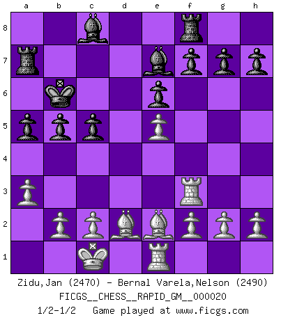 Last move : 1/2-1/2 2023 May 21 22:46:48 [Event "FICGS__CHESS__RAPID_GM__000020"] [Site "FICGS"] [Date "2023.04.08"] [Round "1"] [White "Zidu,Jan"] [Black "Bernal Varela,Nelson"] [Result "1/2-1/2"] [WhiteElo "2470"] [BlackElo "2490"] 1.e4 c5 2.Nf3 e6 3.d4 cxd4 4.Nxd4 Nc6 5.Nc3 a6 6.Be3 Nf6 7.a3 b5 8.Nxc6 dxc6 9.Qxd8+ Kxd8 10.O-O-O Kc7 11.Bf4+ Kb6 12.Be2 Bc5 13.Rd3 a5 14.Rf1 Ra7 15.e5 Nd5 16.Bd2 Be7 17.Re1 Nxc3 18.Rxc3 c5 19.Rf3 Rf8 20.Rg3 Rg8 21.Rf3 Rf8 22.Rg3 Rg8 23.Rf3 Rf8 1/2-1/2 Follow this game move after move (download)Fischer Chess play was always razor-sharp, rational and brilliant. One of the best ever. (Dave Regis) Der Bart als Geschlechtszeichen mitten im Gesicht ist obszön. Daher gefällt er den Weibern. [Zugegeben, kein Schachzitat, aber unglaublich originell] (Arthur Schopenhauer) Algunos sacrificios son sólidos, los demás son míos. (Mikhail Tal) J'apprécie les joueurs d'est-indienne, c'est grâce à eux que je nourris ma famille depuis tant d'années. (Petrosian) Never was anything great achieved without danger. (Niccolo Machiavelli)