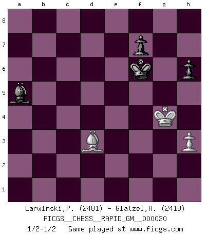 Last move : 1/2-1/2 2023 May 5 20:11:27 [Event "FICGS__CHESS__RAPID_GM__000020"] [Site "FICGS"] [Date "2023.04.08"] [Round "1"] [White "Larwinski,Paul"] [Black "Glatzel,Hans Joachim"] [Result "1/2-1/2"] [WhiteElo "2481"] [BlackElo "2419"] 1.d4 d5 2.c4 e6 3.Nc3 c6 4.Nf3 Nf6 5.Bg5 h6 6.Bxf6 Qxf6 7.e3 Nd7 8.Be2 Be7 9.O-O O-O 10.Qc2 a6 11.Bd3 Rd8 12.Rac1 Rb8 13.cxd5 exd5 14.e4 dxe4 15.Nxe4 Qf4 16.Rfe1 Qc7 17.a3 Nf8 18.Re3 Bg4 19.Qc3 Bxf3 20.Rxf3 b5 21.Nc5 Qd6 22.Nxa6 Rb6 23.Nb4 Ne6 24.Nxc6 Rxc6 25.Qxc6 Qxc6 26.Rxc6 Nxd4 27.Rc3 Nxf3+ 28.gxf3 Bf6 29.Rb3 Bxb2 30.Kf1 g6 31.Bxb5 Rd2 32.Ke1 Rc2 33.Rd3 Be5 34.h3 Bc7 35.a4 Ba5+ 36.Kd1 Rxf2 37.Rd5 Rxf3 38.Be2 Rf5 39.Rxf5 gxf5 40.Bd3 f4 41.Ke2 Kg7 42.Kf3 Bd2 43.a5 Bxa5 44.Kxf4 Kf6 45.Kg4 1/2-1/2 Follow this game move after move (download)What is the object of playing a gambit opening?... To acquire a reputation of being a dashing player at the cost of losing a game. (Siegbert Tarrasch) Über die Verhaftung Bobby Fischers: Warum es die Bush-Administration für nötig befindet einen 61 Jahre alten Mann zu hetzten, der für niemanden ausser sich selbste eine Gefahr darstellt ist ein Rätsel. (Nigel Short) En la vida, como en el Ajedrez, los Peones propios obstruyen nuestro camino. La gran fortuna de un hombre, su comodidad, placer, hijos, libros, que deberían ayudarle a ganar, con mucha frecuencia lo ponen en Jaque Mate. (Charles Buxton) Dieu déplace le joueur, et celui-ci la pièce. Quel Dieu derrière Dieu commence donc la trame ? Arturo Perez-Reverte (prix de littérature policière 1993). Excelling at chess has long been considered a symbol of more general intelligence. That is an incorrect assumption in my view, as pleasant as it might be. But for the purposes of argument and investigation, chess is, in Russkin-Gutman's words, 'an unparalleled laboratory, since both the learning process and the degree of ability obtained can be objectified and quantified, providing an excellent comparative framework on which to use rigorous analytical techniques.' (The Chess Master and the Computer, by Garry Kasparov - 2010)