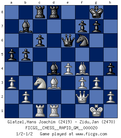 Last move : 1/2-1/2 2023 May 27 11:43:25 [Event "FICGS__CHESS__RAPID_GM__000020"] [Site "FICGS"] [Date "2023.04.08"] [Round "1"] [White "Glatzel,Hans Joachim"] [Black "Zidu,Jan"] [Result "1/2-1/2"] [WhiteElo "2419"] [BlackElo "2470"] 1.d4 Nf6 2.c4 e6 3.Nf3 d5 4.Nc3 c6 5.e3 Nbd7 6.Qc2 Bd6 7.Bd3 dxc4 8.Bxc4 O-O 9.O-O b5 10.Bd3 Bb7 11.a3 Rc8 12.Rd1 a5 13.Ng5 h6 14.Nge4 Be7 15.Nxf6+ Nxf6 16.Qe2 Bd6 17.e4 e5 18.dxe5 Bxe5 19.Be3 Qc7 20.g3 Qe7 21.Rac1 Rfe8 22.Nb1 Qe6 23.f3 h5 24.Nc3 h4 25.Qf2 Red8 26.Bf4 Bd4 1/2-1/2 Follow this game move after move (download)Weak points or holes in the opponent's position must be occupied by pieces not Pawns. (Siegbert Tarrasch) Zu meiner Zeit war ein 20 jähriger ein junger Spieler, heute ist er ein Veteran. (Garry Kasparov) El Ajedrez, como cualquier otra actividad creativa, puede existir solo a través de méritos combinados de aquellos que tienen talento creativo y de aquellos que tienen la habilidad de organizar un trabajo creativo. (Mikhail Botvinnik) Votre seul travail dans les ouvertures est d'obtenir un milieu de partie jouable. (Lajos Portish) Macintosh - we might not get everything right, but at least we knew the century was going to end. (Douglas Adams)