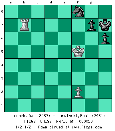 Last move : 1/2-1/2 2023 May 4 8:45:29 [Event "FICGS__CHESS__RAPID_GM__000020"] [Site "FICGS"] [Date "2023.04.08"] [Round "1"] [White "Lounek,Jan"] [Black "Larwinski,Paul"] [Result "1/2-1/2"] [WhiteElo "2487"] [BlackElo "2481"] 1.e4 e5 2.Nf3 Nc6 3.Bb5 a6 4.Ba4 Nf6 5.O-O Nxe4 6.d4 b5 7.Bb3 d5 8.dxe5 Be6 9.c3 Be7 10.Nbd2 Nc5 11.Bc2 d4 12.Nb3 d3 13.Bb1 Bf5 14.Nbd4 Nxd4 15.cxd4 Ne6 16.Bxd3 Bxd3 17.Qxd3 Qd5 18.Rd1 O-O 19.Be3 Rad8 20.h3 f5 21.exf6 Bxf6 22.Qa3 Rd6 23.Rac1 a5 24.Qxa5 Ra8 25.Qe1 Qxa2 26.Rd2 Qd5 27.Qd1 Rda6 28.Kh1 Be7 29.Ng1 Bd6 30.Rd3 Ra4 31.Ne2 b4 32.Ng1 Ra2 33.Rb1 Nf8 34.Nf3 Ng6 35.Qc2 Ne7 36.Re1 Nf5 37.Bc1 h6 38.Kg1 Ra1 39.Kf1 Kh8 40.R3d1 b3 41.Qc3 Kg8 42.Qd3 Rf8 43.Qe2 Ra4 44.Qe6+ Qxe6 45.Rxe6 Rb8 46.Bd2 Rb5 47.Be1 Ne7 48.g3 Nd5 49.Rc1 Kh7 50.h4 Ra2 51.Re2 Ra4 52.Bd2 Ra2 53.Rb1 Nb6 54.Ne5 c5 55.Nf7 Bb8 56.dxc5 Nc4 57.Bc3 Rxc5 58.Kg2 Rf5 59.Nd8 Be5 60.g4 Bxc3 61.gxf5 Bxb2 62.Nf7 Kg8 63.Nd6 Nxd6 64.R1xb2 Nxf5 65.Rxa2 bxa2 66.Rxa2 Nxh4+ 67.Kg3 Ng6 68.Ra7 Nf8 69.Kg4 Kh7 70.Kf5 Kg8 71.Rb7 Kh7 1/2-1/2 Follow this game move after move (download)Checkers is for tramps. (Paul Morphy) Als er Schachweltmeister wurde ließ er praktisch alle stärksten Sovietspieler für sich arbeiten. Wenn ein auch nur mittelmässiger Meister ein Spezialist für eine bestimmte Eröffnung war, wurde er von Karpov gerufen. Das wurde alles geheim gehalten. (Mikhail Moiseyevich Botvinik) Me siento como si fuera una pieza en una partida de Ajedrez, cuando mi oponente me indica: esa pieza no puede ser movida. (Soren Kierkegaard) Le moment que je préfère le plus dans une rencontre, c'est celui où je sens que la personnalité de l'adversaire se brise. (Robert Fischer) A government big enough to give you everything you want is strong enough to take everything you have. (Thomas Jefferson)