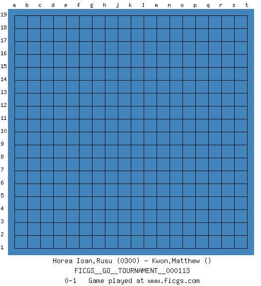 Last move : 0-1 2023 May 14 10:27:38 [Event "FICGS__GO__TOURNAMENT__000113"] [Site "FICGS"] [Date "2023.04.13"] [Round "1"] [Black "Horea Ioan,Rusu"] [White "Kwon,Matthew"] [Result "0-1"] [Rating 1 "0300"] 0-1 This go game has been lost on time (started : 2023.04.13 20:30:54) Follow this game move after move (download)When your opponent is thick, you must also become thick. (Otake Hideo, 9p) It's not enough to succeed. Others must fail. (Gore Vidal)