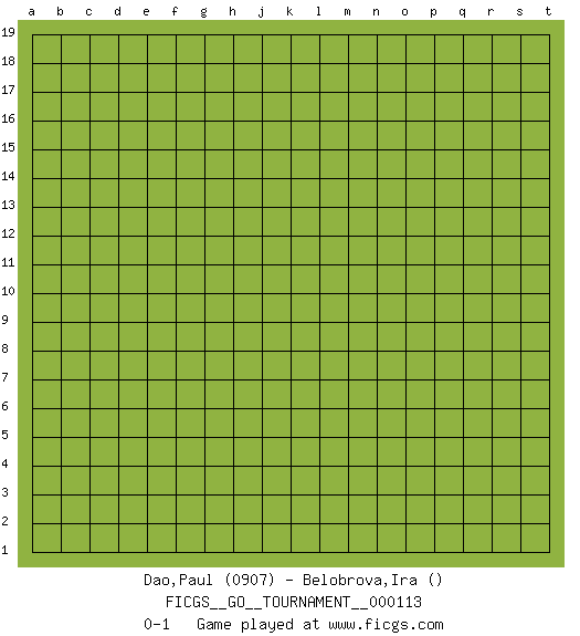 Last move : 0-1 2023 May 14 10:27:38 [Event "FICGS__GO__TOURNAMENT__000113"] [Site "FICGS"] [Date "2023.04.13"] [Round "1"] [Black "Dao,Paul"] [White "Belobrova,Ira"] [Result "0-1"] [Rating 1 "0907"] 0-1 This go game has been lost on time (started : 2023.04.13 20:30:54) Follow this game move after move (download)Beware of the clumsy double contact. (Anonymous) There are lots of people who mistake their imagination for their memory. (Josh Bilings)