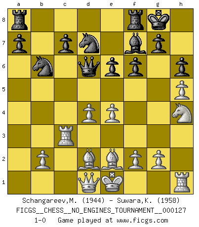 Last move : 1-0 2023 July 17 18:45:7 [Event "FICGS__CHESS__NO_ENGINES_TOURNAMENT__000127"] [Site "FICGS"] [Date "2023.04.16"] [Round "1"] [White "Schangareev,Mirzian"] [Black "Suwara,Kazimierz"] [Result "1-0"] [WhiteElo "1944"] [BlackElo "1958"] 1.d4 d5 2.c4 Nf6 3.cxd5 Nxd5 4.Nf3 Bf5 5.Nbd2 Bg6 6.h4 f6 7.e4 Nb6 8.h5 Bf7 9.Nb3 e6 10.Bd2 N8d7 11.Be2 h6 12.Rc1 Bd6 13.Nh4 Qe7 14.a4 Nxa4 15.Na5 Nab6 16.Nxb7 O-O 17.Nxd6 Qxd6 18.Rc3 1-0 This chess game has been lost on time (started : 2023.04.16 3:28:37) Follow this game move after move (download)The older I grow, the more I value pawns. (Paul Keres) Auf jeden Fall musst du zuerst Rechtsanwalt werden, damit du deine eigenen Interessen und die deiner Familie vertreten kannst. [Brief an seinen Sohn] (José Raúl Capablanca) La última cosa en que Fischer estaba interesado era en tonterías, siempre y cuando el Ajedrez estuviera involucrado. (Elie Agur) Un millionnaire : 'Monsieur Steinitz ! Vous ne participez aux tournois que pour l'argent, alors que moi je n'y viens que pour l'honneur.' Steinitz : 'Chacun joue pour ce qu'il n'a pas'... The only sure thing about luck is that it will change. (Wilson Mizner)