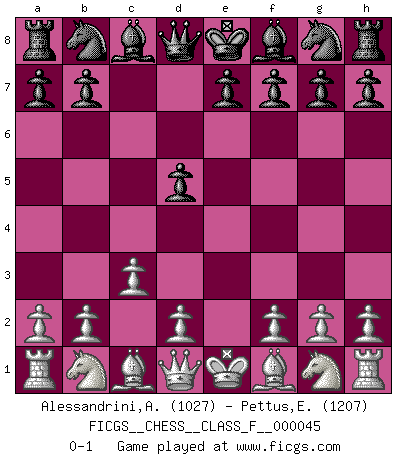 Last move : 0-1 2007 October 10 6:10:40 [Event "FICGS__CHESS__CLASS_F__000045"] [Site "FICGS"] [Date "2007.08.27"] [Round "1"] [White "Alessandrini,Alfredo"] [Black "Pettus,Erle"] [Result "0-1"] [WhiteElo "1027"] [BlackElo "1207"] 1.e4 c6 2.c3 d5 3.exd5 cxd5 0-1 This chess game has been lost on time (started : 2007.08.27 20:11:16) Caro-Kann defense Player Black won this chess game. Follow this game move after move (download)Fischer is an American Chess tragedy on par with Morphy and Pillsbury. (Mig Greengard) Dein Körper muss in Topform sein. Dein Schach verfällt, wenn dein Körper verfällt. Der Körper kann nicht vom Geist getrennt werden. (Robert James Fischer) Dios mío, Bobby Fischer juega tan simple. (Alexei Suetin) Les Echecs sont et restent toujours un combat, un combat intégral comme la boxe, la lutte ou un autre sport, et où il doit y avoir un vainqueur et un vaincu. (Joseph Emil Diemer) A good teacher is like a candle - it consumes itself to light the way for others. (Author unknown)