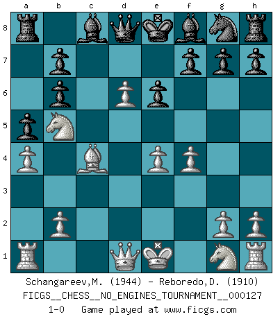 Last move : 1-0 2023 April 21 9:9:29 [Event "FICGS__CHESS__NO_ENGINES_TOURNAMENT__000127"] [Site "FICGS"] [Date "2023.04.16"] [Round "1"] [White "Schangareev,Mirzian"] [Black "Reboredo,Daniel"] [Result "1-0"] [WhiteElo "1944"] [BlackElo "1910"] 1.d4 d5 2.c4 Nc6 3.Nc3 dxc4 4.d5 Ne5 5.f4 Nd7 6.e4 Nb6 7.a4 a5 8.Be3 Qd6 9.Nb5 Qd8 10.Bxb6 cxb6 11.Bxc4 e6 12.d6 1-0 Follow this game move after move (download)Chess is a forcing house where the fruits of character can ripen more fully than in life. (Edward Morgan Foster) Die Neutralität betrachte ich als eine schwere Krankheit. (Viktor Kortschnoi) La única cosa que los jugadores de Ajedrez tienen en común, es el Ajedrez. (Lodewijk Prins) Avant la finale, les dieux ont créé le milieu de partie. (Tarrasch) The worth of a book is to be measured by what you can carry away from it. (James Bryce)