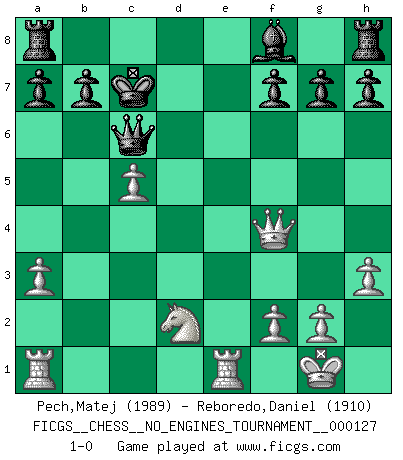 Last move : 1-0 2023 August 15 19:42:14 [Event "FICGS__CHESS__NO_ENGINES_TOURNAMENT__000127"] [Site "FICGS"] [Date "2023.04.16"] [Round "1"] [White "Pech,Matej"] [Black "Reboredo,Daniel"] [Result "1-0"] [WhiteElo "1989"] [BlackElo "1910"] 1.d4 d5 2.c4 e5 3.dxe5 d4 4.Nf3 Nc6 5.a3 Nge7 6.b4 Bg4 7.h3 Bxf3 8.exf3 Nxe5 9.f4 N5g6 10.Bd3 Qd6 11.O-O Nxf4 12.c5 Qf6 13.Qa4+ c6 14.Bxf4 Qxf4 15.b5 Qc7 16.Re1 Kd8 17.Nd2 cxb5 18.Bxb5 Nc6 19.Qxd4+ Qd7 20.Qa4 Kc7 21.Bxc6 Qxc6 22.Qf4+ 1-0 Follow this game move after move (download)There is only one thing Fischer does in Chess without pleasure: to lose ! (Boris Spassky) Jeder weiß, dass Gasprom Putins persönliches Machtinstrument ist. Die Firma wird vom Kreml aus geleitet und wird schon deshalb nie transparent sein. (Garry Kasparov) Las Aperturas te enseñan aperturas. ¡Los Finales te enseñan Ajedrez!. (Stephan Gerzadowicz) Ne tendez aucun piège pour le plaisir ! Ne jouez rien dans l'espoir que l'adversaire réagisse de façon stupide ! Prenez toujours pour acquis que l'adversaire va trouver le meilleur coup ! Ne jouez jamais de coup dans l'espoir que l'adversaire ne voie pas la menace ! Chacun de vos coups doit améliorer la position d'une façon ou d'une autre. Sometimes it pays to stay in bed in Monday, rather than spending the rest of the week debugging Monday's code. (Dan Salomon)
