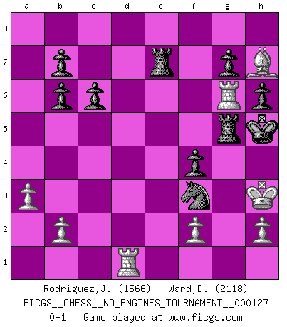 Last move : 0-1 2023 July 6 19:15:4 [Event "FICGS__CHESS__NO_ENGINES_TOURNAMENT__000127"] [Site "FICGS"] [Date "2023.04.16"] [Round "1"] [White "Rodriguez,Juan Antonio"] [Black "Ward,David"] [Result "0-1"] [WhiteElo "1566"] [BlackElo "2118"] 1.e4 e5 2.Nf3 Nc6 3.Bc4 Bc5 4.O-O d6 5.c3 Nf6 6.d4 exd4 7.cxd4 Bb6 8.Nc3 O-O 9.Bg5 Bg4 10.e5 dxe5 11.dxe5 Qxd1 12.Raxd1 Bxf3 13.gxf3 Nxe5 14.Be2 Ned7 15.Nd5 Nxd5 16.Rxd5 Nc5 17.Rd2 Ne6 18.Be3 Rfe8 19.Rfd1 Nf8 20.Bxb6 axb6 21.a3 Ra5 22.Bc4 Rae5 23.Bd5 c6 24.Be4 f5 25.Bc2 Ng6 26.Kf1 R8e7 27.Rd8+ Kf7 28.Bb3+ Kf6 29.R1d6+ Kg5 30.Kg2 f4 31.Bg8 Nh4+ 32.Kh3 h6 33.Bh7 Nxf3 34.Rg6+ Kh5 35.Rd1 Rg5 0-1 Follow this game move after move (download)Chess is a cold bath for the mind. (Sir John Simon) Die Idee von Capablanca, Schach als Fach in den Schulen zu lehren, ist großartig. (Fidel Castro) Haz el enroque temprano y seguido. (Rob Sillars) Ce qui est bien, c'est d'avoir tout un tas de pièces en prise : l'adversaire ne peut en prendre qu'une à la fois. Cité par Thierry Audin. A computer lets you make more mistakes faster than any invention in human history - with the possible exceptions of handguns and tequila. (Mitch Ratcliffe)