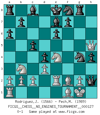 Last move : 0-1 2023 July 29 21:49:55 [Event "FICGS__CHESS__NO_ENGINES_TOURNAMENT__000127"] [Site "FICGS"] [Date "2023.04.16"] [Round "1"] [White "Rodriguez,Juan Antonio"] [Black "Pech,Matej"] [Result "0-1"] [WhiteElo "1566"] [BlackElo "1989"] 1.e4 e6 2.Nc3 d5 3.d3 Nf6 4.e5 Nfd7 5.Nf3 c5 6.Be2 Nc6 7.Bf4 a6 8.O-O Be7 9.Re1 g5 10.Bg3 g4 11.Nd2 h5 12.Bf1 Rg8 13.Nb3 Nf8 14.f4 gxf3 15.Qxf3 h4 16.Bf2 d4 17.Ne4 Nxe5 18.Qe2 Qc7 19.Qh5 Ng4 20.Re2 Qxh2+ 0-1 Follow this game move after move (download)Even the laziest King flees wildly in the face of a double check ! (Aaron Nimzowitsch) Je älter ich werde, um so mehr schätze ich die Bauern. (Paul Keres) Un buen jugador siempre tiene buena suerte. (José Raúl Capablanca) Les Echecs, c'est l'art de la guerre sans les charniers, c'est la résurrection des morts tombés au champ d'honneur, l'espoir perpétuel, la suprématie de l'intelligence sur la force, la culture de l'esprit. (F. Szpiner) You can't play chess if you're groggy from pills. (Anatoly Karpov)
