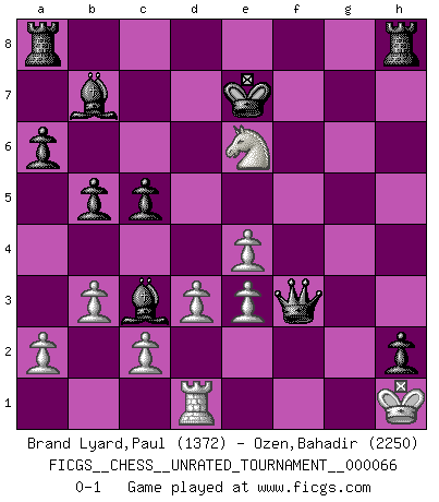 Last move : 0-1 2023 April 25 9:43:36 [Event "FICGS__CHESS__UNRATED_TOURNAMENT__000066"] [Site "FICGS"] [Date "2023.04.16"] [Round "1"] [White "Brand Lyard,Paul"] [Black "Ozen,Bahadir"] [Result "0-1"] [WhiteElo "1372"] [BlackElo "2250"] 1.e4 c5 2.Bc4 e6 3.Nf3 a6 4.O-O b5 5.Be2 Bb7 6.d3 Be7 7.Nbd2 Nc6 8.b3 Bf6 9.Rb1 g5 10.g3 g4 11.Ne1 h5 12.h4 gxh3 13.Bxh5 Qc7 14.Ndf3 Rxh5 15.Ng5 Rh8 16.Kh2 Bc3 17.Bf4 d6 18.Nef3 Nf6 19.Nxf7 Kxf7 20.Ng5+ Ke7 21.Qf3 Nd4 22.Bxd6+ Qxd6 23.Qe3 Ng4+ 24.Kh1 Nxe3 25.fxe3 Nf5 26.Rf3 Nxg3+ 27.Rxg3 Qxg3 28.Rg1 Qf2 29.Nxe6 h2 30.Rd1 Qf3+ 0-1 Follow this game move after move (download)It's always better to sacrifice your opponent's men. (Savielly Tartakover) Du musst Deinen Gegner in einen tiefen dunklen Wald führen wo 2+2=5 ist und wo der Weg, der wieder hinausführt, nur breit genug für einen ist. (Mikhail Nekhemyevich Tal) El jugador táctico sabe que hacer cuando hay algo que hacer; mientras que el estratega sabe que hacer cuando no hay nada que hacer. (Gerald Abrahams) Mais l'homme est une créature légère et illogique : semblable au joueur d'échecs, il n'aime que le processus du but à atteindre, non le but lui-même. (Dostoïevsky) A generalist learns less and less about more and more until he knows nothing about everything. (Author unknown)