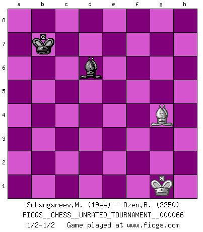 Last move : 1/2-1/2 2023 May 21 10:55:58 [Event "FICGS__CHESS__UNRATED_TOURNAMENT__000066"] [Site "FICGS"] [Date "2023.04.16"] [Round "1"] [White "Schangareev,Mirzian"] [Black "Ozen,Bahadir"] [Result "1/2-1/2"] [WhiteElo "1944"] [BlackElo "2250"] 1.d4 Nf6 2.c4 e6 3.g3 Bb4+ 4.Bd2 Be7 5.Nf3 d5 6.Bg2 O-O 7.O-O c6 8.Bf4 dxc4 9.Ne5 Nd5 10.Nxc4 Nxf4 11.gxf4 Nd7 12.e3 Qc7 13.Nc3 b6 14.Ne5 Nxe5 15.fxe5 Ba6 16.Re1 Rad8 17.Qa4 Bb7 18.Rac1 a6 19.b4 c5 20.bxc5 bxc5 21.Ne4 Bxe4 22.Bxe4 Qa7 23.Red1 cxd4 24.exd4 Rb8 25.Rc6 Rb4 26.Qxa6 Qxa6 27.Rxa6 Rd8 28.Bc2 Rc4 29.Bb3 Rcxd4 30.Rxd4 Rxd4 31.Ra8+ Bf8 32.a4 Re4 33.Ra5 Rb4 34.Rb5 Rxb5 35.axb5 g5 36.b6 Bg7 37.h4 h6 38.hxg5 hxg5 39.b7 Bxe5 40.Bd1 Kg7 41.Bh5 Bd6 42.Bd1 f5 43.f3 Kf6 44.Ba4 g4 45.fxg4 fxg4 46.Bd7 Ke7 47.Ba4 Kd8 48.Bb3 Kc7 49.Bxe6 Kxb7 50.Bxg4 1/2-1/2 Comment by player 1 : Mirzian Schangareev : Arkadaşım merhaba! Şimdi oyunumuzu sonuna kadar oynamak ister misiniz? Follow this game move after move (download)No Chess Grandmaster is normal; they only differ in the extent of their madness. (Viktor Korchnoi) Dieses schreckliche Gefühl, dass ich gegen eine Maschine spielte, die niemals Fehler macht, zerschmetterte meinen Widerstand. (Mark Taimanov) Evita las multitudes. Haz independientemente tu propio razonamiento. Trata de ser el jugador de Ajedrez, no la pieza de Ajedrez. (Ralph Charell) Le jeu d'échecs fait naître et fortifie en nous plusieurs qualités précieuses dans le cours de l'existence, telles que la prévoyance, la circonspection, la prudence, et la persévérance. (Benjamin Franklin - 1783, la morale des échecs) Over-the-board chess is the favorite of mortals, correspondence chess is the favorite of the gods. (Eduard Dyckhoff)