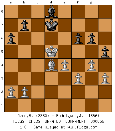 Last move : 1-0 2023 June 6 18:2:48 [Event "FICGS__CHESS__UNRATED_TOURNAMENT__000066"] [Site "FICGS"] [Date "2023.04.16"] [Round "1"] [White "Ozen,Bahadir"] [Black "Rodriguez,Juan Antonio"] [Result "1-0"] [WhiteElo "2250"] [BlackElo "1566"] 1.Nf3 Nf6 2.c4 c5 3.Nc3 e6 4.g3 Nc6 5.Bg2 Be7 6.O-O O-O 7.d4 cxd4 8.Nxd4 d5 9.cxd5 exd5 10.Be3 a6 11.Qa4 Bd7 12.Rad1 Nxd4 13.Qxd4 Be6 14.Nxd5 Bxd5 15.Bxd5 Nxd5 16.Qxd5 Qxd5 17.Rxd5 Rad8 18.Rxd8 Rxd8 19.Rc1 Bd6 20.Kg2 h6 21.Rd1 Bc7 22.Rxd8+ Bxd8 23.Kf3 h5 24.Ke4 Kf8 25.Kd5 Ke7 26.Bg5+ f6 27.Be3 Kd7 28.h3 Bc7 29.Bd4 Ba5 30.e4 Bd8 31.f3 g6 32.g4 1-0 Follow this game move after move (download)Chess is the art which expresses the science of logic. (Mikhail Botvinnik) Im Leben werden Partien nie so unstrittig gewonnen wie im Spiel (Emanuel Lasker) No es tiempo de jugar al Ajedrez cuando la casa esta en llamas. (Proverbio Italiano) Aucun coup ne doit être joué sans but. (Pedro Damiano) Mac users swear by their computers. PC users swear at their computers. (Author unknown)