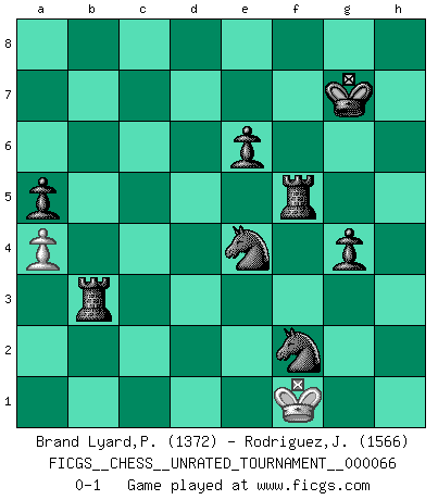 Last move : 0-1 2023 June 30 21:39:53 [Event "FICGS__CHESS__UNRATED_TOURNAMENT__000066"] [Site "FICGS"] [Date "2023.04.16"] [Round "1"] [White "Brand Lyard,Paul"] [Black "Rodriguez,Juan Antonio"] [Result "0-1"] [WhiteElo "1372"] [BlackElo "1566"] 1.e4 c6 2.Bc4 d5 3.exd5 cxd5 4.Bb5+ Bd7 5.Bxd7+ Qxd7 6.d3 Nc6 7.Nf3 Nf6 8.O-O e6 9.Re1 Be7 10.h3 O-O 11.Qd2 h6 12.g4 Nh7 13.Re3 Ng5 14.Ne5 Nxe5 15.Kg2 Ng6 16.h4 Nh7 17.g5 hxg5 18.hxg5 Bxg5 19.Qc3 Bxe3 20.Bxe3 Qc6 21.Qxc6 bxc6 22.Nd2 a6 23.Bc5 Rfb8 24.b3 Nf6 25.Bd6 Rb7 26.c3 Rd8 27.Bc5 Nf4+ 28.Kf3 Nxd3 29.Be7 Rxe7 30.c4 Rb7 31.Rf1 dxc4 32.Nxc4 Nb4 33.Ra1 Rbd7 34.Ne5 Rd5 35.Rc1 Rxe5 36.a3 Nd3 37.Rxc6 a5 38.Ra6 g6 39.a4 Ne4 40.Kg4 Ndxf2+ 41.Kf4 R8d5 42.Ra8+ Kg7 43.Ra6 Rf5+ 44.Ke3 Rd3+ 45.Ke2 Rxb3 46.Rc6 g5 47.Rxe6 fxe6 48.Kf1 g4 0-1 Follow this game move after move (download)The winner of the game is the player who makes the next-to-last mistake. (Savielly Tartakover) Der Bart als Geschlechtszeichen mitten im Gesicht ist obszön. Daher gefällt er den Weibern. [Zugegeben, kein Schachzitat, aber unglaublich originell] (Arthur Schopenhauer) Me dio la sensación de como si yo estuviera jugando en contra del mismo Ajedrez. - al estar jugando en contra de Robert Fischer (Walter Shipman) Lorsque vous vous retrouvez devant une position atroce, ne tendez pas un ultime piège dérisoire avec l'intention d'abandonner si l'adversaire le déjoue ! Faites-vous plutôt un devoir de résister comme si votre vie en dépendait. Jouez le coup qui vous déplairait au centuple si vous étiez dans la peau de votre tortionnaire ! There are two kinds of tragedy in this world, one is not getting what you want and the other is getting. (Lord of war)