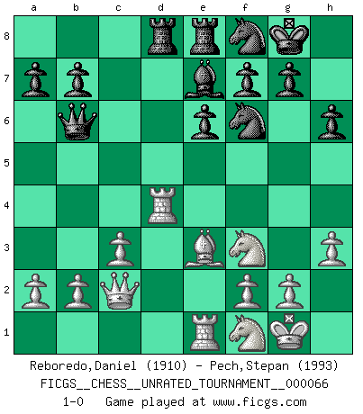 Last move : 1-0 2023 August 9 15:49:54 [Event "FICGS__CHESS__UNRATED_TOURNAMENT__000066"] [Site "FICGS"] [Date "2023.04.16"] [Round "1"] [White "Reboredo,Daniel"] [Black "Pech,Stepan"] [Result "1-0"] [WhiteElo "1910"] [BlackElo "1993"] 1.e4 c6 2.d4 d5 3.Nc3 dxe4 4.Nxe4 Bf5 5.Ng3 Bg6 6.Nf3 Nd7 7.c3 e6 8.Bd3 Bxd3 9.Qxd3 Ngf6 10.Bg5 Be7 11.O-O O-O 12.Rfe1 h6 13.Bf4 Re8 14.Rad1 Qb6 15.Qc2 Rad8 16.h3 c5 17.Nf1 cxd4 18.Rxd4 Nf8 19.Be3 1-0 This chess game has been lost on time (started : 2023.04.16 3:29:45) Follow this game move after move (download)A great player and a great example for many. His book My 60 Memorable Games had a big impact on me. It is a shame he didn't continue to enrich the world of chess with his unparalleled understanding after 1972. (Jan Timman, about Bobby Fischer's death) Es tut gut, die Entwicklungsperiode von, [...] demokratischem Geist durchdringen zu lassen. Wie undemokratisch wäre es doch beispielsweise, den einen Offizier große Spaziertouren vornehmen zu lassen, während die anderen zu Hause säßen und sich entsetzlich langweilten. (Aaron Nimzowitsch) Dejen al perfeccionista jugar por correo. (Yasser Seirawan) J'ai toujours senti une vague pitié pour l'homme qui ne connaît rien aux échecs, tout comme j'en aurais pour un homme ignorant de l'amour. Les Echecs, comme la musique ou comme l'amour, ont le pouvoir de rendre heureux. (Siegbert Tarrasch) There are lots of people who mistake their imagination for their memory. (Josh Bilings)