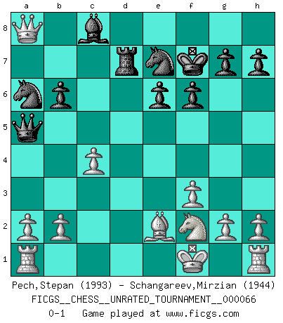 Last move : 0-1 2023 July 14 12:11:48 [Event "FICGS__CHESS__UNRATED_TOURNAMENT__000066"] [Site "FICGS"] [Date "2023.04.16"] [Round "1"] [White "Pech,Stepan"] [Black "Schangareev,Mirzian"] [Result "0-1"] [WhiteElo "1993"] [BlackElo "1944"] 1.d4 d5 2.c4 e6 3.Nc3 c6 4.e4 dxe4 5.Nxe4 Bb4+ 6.Bd2 Qxd4 7.Bxb4 Qxe4+ 8.Be2 Na6 9.Ba5 b6 10.Qd6 f6 11.f3 Qf5 12.Bxb6 axb6 13.Qxc6+ Kf7 14.Qxa8 Qa5+ 15.Kf1 Ne7 16.Nh3 Rd8 17.Nf2 Rd7 0-1 This chess game has been lost on time (started : 2023.04.16 3:29:45) Follow this game move after move (download)The only thing Chess players have in common is Chess. (Lodewijk Prins) Der Schachmeister von Heute braucht Courage, einen Killerinstinkt, Ausdauer und Arroganz. (Larry Evans) Las ideas audaces son como las piezas del Ajedrez que avanzan hacia adelante. Ellas pueden ser vencidas, pero también pueden iniciar una partida victoriosa. (Goethe) Les sacrifices démontrent seulement que quelqu'un a gaffé. (Savielly Tartacover) Life is like internet, nothing interesting, but noone want to leave it. (Ilmars Cirulis)