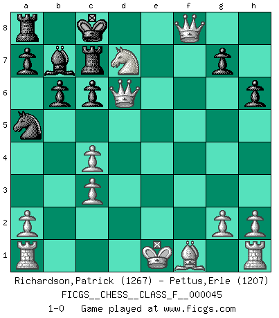 Last move : 1-0 2007 September 17 23:26:36 [Event "FICGS__CHESS__CLASS_F__000045"] [Site "FICGS"] [Date "2007.08.27"] [Round "1"] [White "Richardson,Patrick"] [Black "Pettus,Erle"] [Result "1-0"] [WhiteElo "1267"] [BlackElo "1207"] 1.d4 Nf6 2.c4 e6 3.Nc3 b6 4.e4 Bb7 5.f3 d5 6.Bg5 dxe4 7.fxe4 h6 8.Bh4 Nxe4 9.Bxd8 Nxc3 10.bxc3 Kxd8 11.Nf3 Nc6 12.d5 Na5 13.dxe6 Bd6 14.exf7 c6 15.Qxd6+ Kc8 16.Ne5 Rd8 17.Qe6+ Kb8 18.Qe7 Rc8 19.Qd6+ Rc7 20.Nd7+ Kc8 21.f8Q+ 1-0 Queen's pawn game Promotion Queen by player White (move 21) Player White won this chess game. Follow this game move after move (download)Discovered check is the dive bomber of the Chessboard. (Reuben Fine) Die Elozahlen sind sehr schlecht für das Schach. Jetzt ist Schach eine Sportindustrie, die darauf zielt Elopunkte zu machen. (Miguel Najdorf) Bendita sea la memoria de aquel que dio al mundo este juego inmortal. (A. G. Gardiner) On n'a jamais que l'âge auquel on a commence à jouer aux échecs car après on cesse de vieillir. (Capablanca) There is a great deal of difference between an eager man who wants to read a book and a tired man who wants a book to read. (G.K. Chesterton)