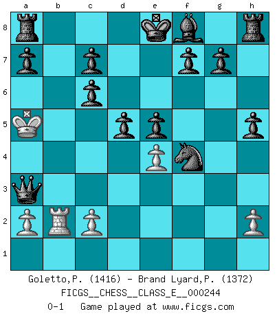 Last move : 0-1 2023 April 28 22:45:4 [Event "FICGS__CHESS__CLASS_E__000244"] [Site "FICGS"] [Date "2023.04.16"] [Round "1"] [White "Goletto,Piero Giuseppe"] [Black "Brand Lyard,Paul"] [Result "0-1"] [WhiteElo "1416"] [BlackElo "1372"] 1.e4 e5 2.Nf3 Nc6 3.Bb5 d6 4.O-O Qf6 5.Nc3 Qg6 6.d3 Bh3 7.Ng5 Bxg2 8.Kxg2 Nf6 9.Ne2 h5 10.Be3 Ng4 11.f3 Nxe3+ 12.Kf2 Nxd1+ 13.Ke1 Nxb2 14.Rb1 Nxd3+ 15.Kd2 Qxg5+ 16.Nf4 Nxf4 17.Bxc6+ bxc6 18.Rb2 Qg2+ 19.Rf2 Qxf2+ 20.Kc3 Qxf3+ 21.Kb4 d5 22.Ka5 Qa3+ 0-1 Follow this game move after move (download)We must make sure that Chess will not be like a dead language, very interesting, but for a very small group. (Sytze Faber) Früher wurde jeder komplizierte Zug, jedes interessante Opfer mit großem Beifall und Enthusiasmus aufgenommen. Heute schaltet man einfach seinen Fritz an, und man kann sehen, was los ist, ob der Zug geht oder nicht. (Vladimir Kramnik) El Ajedrez es despiadado: debes de estar preparado para matar gente. (Nigel Short) Mais n'est-ce pas déjà le limiter injurieusement que d'appeler les échecs un jeu? N'est-ce pas aussi une science, un art, ou quelque chose qui, comme le cercueil de Mahomet entre ciel et terre, est suspendu entre l'un et l'autre, et qui réunit un nombre incroyable de contraires ? (Stefan Zweig) But they are useless. They can only give you answers. (Pablo Picasso, about computers)