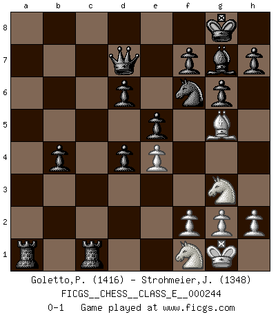 Last move : 0-1 2023 October 10 6:31:0 [Event "FICGS__CHESS__CLASS_E__000244"] [Site "FICGS"] [Date "2023.04.16"] [Round "1"] [White "Goletto,Piero Giuseppe"] [Black "Strohmeier,Josef"] [Result "0-1"] [WhiteElo "1416"] [BlackElo "1348"] 1.e4 c5 2.Nf3 Nc6 3.Bb5 g6 4.O-O Bg7 5.Nc3 d6 6.d3 Bd7 7.Bg5 Nf6 8.Bxc6 Bxc6 9.d4 cxd4 10.Ne2 e5 11.Ng3 Qb6 12.c4 Qxb2 13.Rb1 Qxa2 14.Re1 Qxc4 15.Rc1 Qb4 16.Re2 O-O 17.Rb1 Qa5 18.Nd2 Bb5 19.Nf3 Bxe2 20.Qxe2 Qc7 21.Qe1 a5 22.Ra1 b5 23.Rc1 Qd7 24.Nd2 a4 25.Nf3 Rfc8 26.Rd1 a3 27.Nd2 b4 28.Rb1 a2 29.Rb2 a1Q 30.Rb1 Qc3 31.Rc1 Qxc1 32.Qxc1 Rxc1+ 33.Ndf1 R8a1 0-1 Follow this game move after move (download)In Chess, as it is played by masters, chance is practically eliminated. (Emanuel Lasker) Er war ein guter Schachspieler, aber ich kann Leute nicht ausstehen, die 'Heil Hitler' rufen (Über Alexander Aljechin). (Miguel Najdorf) No hay un Gran Maestro de Ajedrez que sea normal; solo se diferencían ellos por la magnitud de su locura. (Viktor Korchnoi) Le succès, c'est être capable d'aller d'échec en échec sans perdre son enthousiasme. (Winston Churchill) I take risks, sometimes patients die, but not taking risks causes more patients to die. So I guess my biggest problem is I've been cursed with the ability to do the math. (Gregory House, House M.D.)