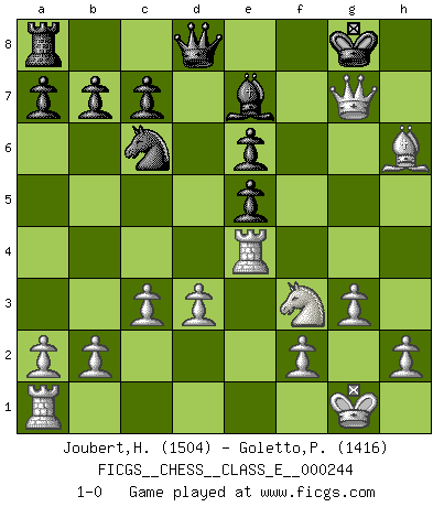 Last move : 1-0 2023 June 7 19:1:5 [Event "FICGS__CHESS__CLASS_E__000244"] [Site "FICGS"] [Date "2023.04.16"] [Round "1"] [White "Joubert,Hennie"] [Black "Goletto,Piero Giuseppe"] [Result "1-0"] [WhiteElo "1504"] [BlackElo "1416"] 1.e4 e5 2.Bc4 Nc6 3.Nc3 Nf6 4.d3 d5 5.Nxd5 Be6 6.Nxf6+ gxf6 7.Bxe6 fxe6 8.Nf3 Rg8 9.g3 f5 10.Qe2 Bb4+ 11.c3 Bc5 12.O-O fxe4 13.Qxe4 Be7 14.Qxh7 Rf8 15.Qg6+ Rf7 16.Re1 Kf8 17.Re4 Rg7 18.Bh6 Kg8 19.Qxg7+ 1-0 Follow this game move after move (download)For me, Chess is life and every game is like a new life. Every Chess player gets to live many lives in one lifetime. (Eduard Gufeld) Ich hatte Angst gegen einen russischen Großmeister zu verlieren, und er befürchtete gegen einen kleinen Jungen zu verlieren. (über ein Remis gegen Juri Awerbach). (Robert James Fischer) El Ajedrez es realmente noventa y nueve por ciento calculación. (Soltis) Horreur, mais aussi harmonie suprême : qu'y avait-il en effet au monde en dehors des échecs ? Le brouillard, l'inconnu, le non-être... (Vladimir Nabokov) Gambling : The sure way of getting nothing from something. (Wilson Mizner)
