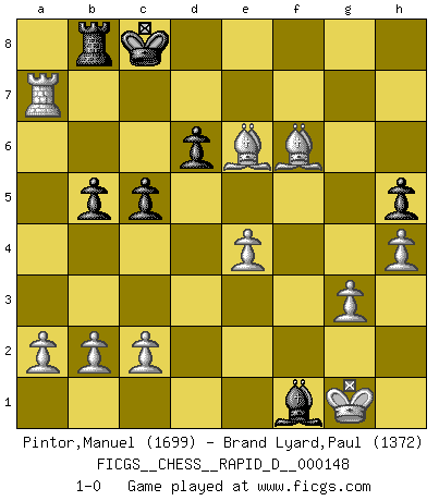 Last move : 1-0 2023 April 26 2:17:23 [Event "FICGS__CHESS__RAPID_D__000148"] [Site "FICGS"] [Date "2023.04.16"] [Round "1"] [White "Pintor,Manuel"] [Black "Brand Lyard,Paul"] [Result "1-0"] [WhiteElo "1699"] [BlackElo "1372"] 1.e4 e5 2.f4 Qh4+ 3.g3 Qe7 4.f5 Nc6 5.Nf3 Nd4 6.Bc4 Nxf3+ 7.Qxf3 Qb4 8.Qb3 Qxb3 9.Bxb3 d6 10.Nc3 Nf6 11.O-O h5 12.d3 Ng4 13.Nd5 Kd8 14.Ne3 Nxe3 15.Bxe3 Ke7 16.h4 b6 17.Bd5 Rb8 18.d4 exd4 19.Bxd4 c5 20.f6+ Kd7 21.fxg7 Bxg7 22.Bxg7 Rg8 23.Rxf7+ Ke8 24.Rxa7 Bh3 25.Bxg8 b5 26.Rf1 Bxf1 27.Bf7+ Kd8 28.Bf6+ Kc8 29.Be6+ 1-0 Follow this game move after move (download)When you don't know what to do, wait for your opponent to get an idea - it's sure to be wrong. (Tarrasch) Wenn ich mich einlogge, glauben die Leute gewöhnlich nicht, dass ich es selbst bin und sie fangen an, mir dumme Fragen zu stellen. Und wenn sie es glauben, stellen sie wieder andere dumme Fragen. (Judith Polgar) El Ajedrez es de 30 a 40 por ciento psicología. Uno no cuenta con esto cuando se juega contra una computadora. No lo puedo confundir. (Judith Polgar) Fischer est le meilleur joueur du monde et Karpov n'est qu'un joueur de bistrot. (Garry Kasparov, agé de 16 ans) You lose, general Kenobi. (General Grievous in Star Wars ep.3)