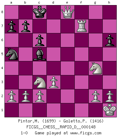 Last move : 1-0 2023 May 9 20:51:14 [Event "FICGS__CHESS__RAPID_D__000148"] [Site "FICGS"] [Date "2023.04.16"] [Round "1"] [White "Pintor,Manuel"] [Black "Goletto,Piero Giuseppe"] [Result "1-0"] [WhiteElo "1699"] [BlackElo "1416"] 1.e4 e5 2.f4 exf4 3.Nf3 Nc6 4.Bc4 d5 5.Bxd5 Bg4 6.O-O Nf6 7.Nc3 Qe7 8.d3 O-O-O 9.Bxf4 Na5 10.Qd2 c6 11.Bb3 Qe8 12.Ne5 Nd7 13.Nxg4 f5 14.exf5 g6 15.Be6 Qxe6 16.fxe6 Nc5 17.Rae1 Nxe6 18.Rxe6 Kd7 19.Qe2 g5 20.Bxg5 h6 21.Bxd8 Kxd8 22.Rf7 Bc5+ 23.Kh1 Kc8 24.Re8+ Rxe8 25.Qxe8+ 1-0 Follow this game move after move (download)A thorough understanding of the typical mating continuations makes the most complicated sacrificial combinations leading up to them not only not difficult, but almost a matter of course. (Siegbert Tarrasch) Schach wird sich dank seiner hohen kulturellen Tradition immer durchsetzen. In näherer Zukunft womöglich sogar als Gegenreaktion auf die maßlose Reizüberflutung im Freizeit- und Spielbereich. (Garry Kasparov) Tu puedes aprender mucho mas de una partida que pierdas que de una partida ganada. Tendras que perder cientos de partidas antes de llegar a ser un buen jugador. (Jose Raul Capablanca) On peut tirer plus d'utilité d'une partie perdue que de 100 parties gagnées. (Capablanca) A computer lets you make more mistakes faster than any invention in human history - with the possible exceptions of handguns and tequila. (Mitch Ratcliffe)