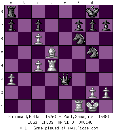 Last move : 0-1 2023 June 11 15:2:0 [Event "FICGS__CHESS__RAPID_D__000148"] [Site "FICGS"] [Date "2023.04.16"] [Round "1"] [White "Goldmund,Heike"] [Black "Paul,Samagata"] [Result "0-1"] [WhiteElo "1526"] [BlackElo "1585"] 1.b4 b5 2.Bb2 Nc6 3.a3 e5 4.e3 d5 5.Bxb5 Bd7 6.Be2 Nf6 7.b5 Na5 8.Nf3 Bd6 9.Nxe5 Be6 10.O-O O-O 11.d3 Re8 12.Nd2 Bf5 13.c4 Bxe5 14.Bxe5 Rxe5 15.Qa4 Nb7 16.Nf3 Re8 17.Nd4 Bd7 18.Rab1 Nc5 19.Qb4 Ne6 20.Nc6 Bxc6 21.bxc6 d4 22.Bf3 dxe3 23.fxe3 Qxd3 24.Rb3 Qd8 25.Qc3 Ng5 26.Be2 Nge4 27.Qc2 Qd6 28.Bf3 Nc5 29.Rd1 Qe7 30.Rb2 Nce4 31.Rd4 Ng5 32.Bd5 Qxe3+ 33.Qf2 Qc1+ 34.Qf1 Re1 35.Rf2 Rxf1+ 36.Rxf1 Qe3+ 0-1 Follow this game move after move (download)All my games are real. (Bobby Fischer) Ein Springer auf f6 gegen die eigene Rochadestellung ist schlimmer als ein rostiger Nagel im Knie. (Efim Bogoljubov) Fischer sacrificó virtualmente todo lo que la mayoría de nosotros los 'debiles' (término que él usa) valoramos, respetamos y apreciamos por el amor de un astuto, a menudo hermoso tablero de juego, por el privilegio ambivalente de ser su mas grande maestro. (Paul Kollar) Les échecs, c'est l'imagination. (David Bronstein) To err is human, but to really foul things up requires a computer. (Farmer's Almanac, 1978)