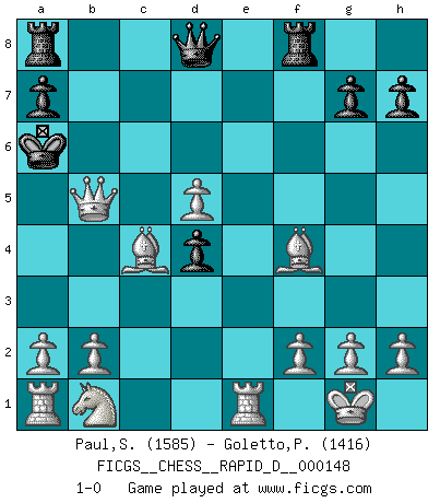 Last move : 1-0 2023 May 11 7:24:19 [Event "FICGS__CHESS__RAPID_D__000148"] [Site "FICGS"] [Date "2023.04.16"] [Round "1"] [White "Paul,Samagata"] [Black "Goletto,Piero Giuseppe"] [Result "1-0"] [WhiteElo "1585"] [BlackElo "1416"] 1.e4 e5 2.c4 Nc6 3.Nf3 Nf6 4.d3 d5 5.cxd5 Nd4 6.Nxd4 Bb4+ 7.Bd2 Nxe4 8.Bxb4 c5 9.dxe4 Bd7 10.Bd2 exd4 11.Bd3 Rf8 12.O-O f5 13.exf5 Bxf5 14.Re1+ Kd7 15.Bxf5+ Kc7 16.Bf4+ Kb6 17.Qb3+ Ka6 18.Bd3+ c4 19.Bxc4+ b5 20.Qxb5+ 1-0 Follow this game move after move (download)Though most people love to look at the games of the great attacking masters, some of the most successful players in history have been the quiet positional players. They slowly grind you down by taking away your space, tying up your pieces, and leaving you with virtually nothing to do ! (Yasser Seirawan) Kein Schachspieler kann gut schlafen. (H. G. Wells) Un jugador que es sorprendido, esta derrotado a medias. (Proverbio) Comme les marins qui ont mille raisons différentes d'aller en mer, les joueurs d'échecs en ont tout autant avant de s'installer devant une table et jouer... (Vincent Bertignac, philosophe) I take risks, sometimes patients die, but not taking risks causes more patients to die. So I guess my biggest problem is I've been cursed with the ability to do the math. (Gregory House, House M.D.)
