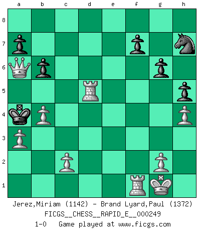 Last move : 1-0 2023 June 8 20:38:23 [Event "FICGS__CHESS__RAPID_E__000249"] [Site "FICGS"] [Date "2023.04.16"] [Round "1"] [White "Jerez,Miriam"] [Black "Brand Lyard,Paul"] [Result "1-0"] [WhiteElo "1142"] [BlackElo "1372"] 1.e4 e5 2.Nf3 Nc6 3.Nc3 d6 4.d3 Bg4 5.Be2 Bxf3 6.Bxf3 Nf6 7.O-O g6 8.Be3 h5 9.h4 Bh6 10.a3 Bxe3 11.fxe3 Rg8 12.b4 b6 13.d4 exd4 14.exd4 Rh8 15.e5 Nh7 16.Bxc6+ Ke7 17.Bxa8 Qxa8 18.Qf3 Qg8 19.Nd5+ Ke6 20.Nxc7+ Ke7 21.exd6+ Kd7 22.Qf4 Kc6 23.d5+ Kb7 24.d7 Qd8 25.d6 Qxd7 26.Qe4+ Qc6 27.Qxc6+ Kc8 28.d7+ Kd8 29.Qa8+ Kxc7 30.Qxh8 Kxd7 31.Rad1+ Kc6 32.Qc8+ Kb5 33.Rd5+ Ka4 34.Qa6+ 1-0 Follow this game move after move (download)When you are lonely, when you feel yourself an alien in the world, play Chess. This will raise your spirits and be your counselor in war. (Aristotle) Im Schach nämlich geht es darum, daß Ich des Gegners klein zu kriegen, sein Ego zu zerbrechen und zu zermahlen, seine Selbstachtung zu zertreten und zu verscharren und seine ganze mißachtenswerte sogenannte Persönlichkeit ein für alle Mal tot zu hacken und zu zerstampfen und dadurch die menschliche Gesellschaft von einer stinkenden Pestbeule zu befreien. Es ist ein königliches Spiel. (Robert James Fischer) La enorme capacidad mental, en la que sin ella no puede un jugador de Ajedrez existir, es demasiado requerida por el Ajedrez al grado de que nunca podrá liberar su mente de este juego. (Albert Einstein) La conception d'un plan est le processus par lequel un joueur exploite les avantages de sa position tout en s'efforçant d'en réduire au minimum les inconvénients. Afin de garantir le succès, un plan doit toujours se fonder sur un diagnostic objectif des particularités d'une position. La conception d'un plan est d'autant plus difficile que la position est équilibrée, et grandement facilitée lorsqu'il n'existe qu'un seul plan susceptible de répondre aux exigences de la position. (Harry Golombek) If only faces could talk... (Pat Summerall, Sportscaster during the Super Bowl)