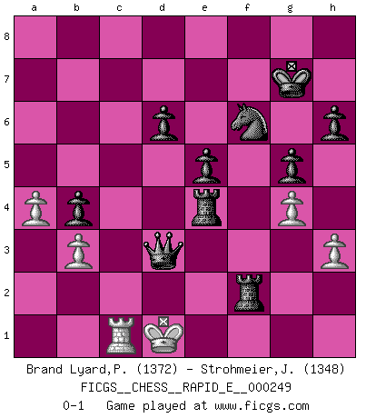 Last move : 0-1 2023 June 10 11:48:48 [Event "FICGS__CHESS__RAPID_E__000249"] [Site "FICGS"] [Date "2023.04.16"] [Round "1"] [White "Brand Lyard,Paul"] [Black "Strohmeier,Josef"] [Result "0-1"] [WhiteElo "1372"] [BlackElo "1348"] 1.e4 c5 2.Bc4 Nc6 3.Qh5 e6 4.d3 Nf6 5.Qg5 h6 6.Qf4 Nd4 7.Kd1 Be7 8.Nc3 d6 9.Bb5+ Nxb5 10.Nxb5 a6 11.Nc3 O-O 12.Qg3 Kh7 13.Nf3 b5 14.Qh3 Ng8 15.Rg1 b4 16.Ne2 e5 17.g4 Be6 18.Ng3 Rc8 19.Bxh6 gxh6 20.Nf5 f6 21.Nxe7 Qxe7 22.Kd2 c4 23.dxc4 Rxc4 24.Rac1 Rxe4 25.Ng5+ fxg5 26.Qd3 Rxf2+ 27.Kd1 Nf6 28.h3 Kg7 29.Qxa6 Bc4 30.b3 Bxa6 31.a4 Qa7 32.Rg3 Qd4+ 33.Rd3 Bxd3 34.cxd3 Qxd3+ 0-1 Follow this game move after move (download)At this time Fischer is simply a level above all the best Chessplayers in the world. (John Jacobs) Das typische an einem Großmeister ist, daß er eine gewonnene Position schnell und schmerzlos gewinnt. (Irving Chernev) Los Peones son nacidos libres, y aún asÃ, se encuentran encadenados por todos lados. (Rick Kennedy) Le moment que je préfère le plus dans une rencontre, c'est celui où je sens que la personnalité de l'adversaire se brise. (Robert Fischer) Empty your mind, be formless, shapeless — like water. (Bruce Lee)