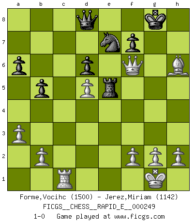 Last move : 1-0 2023 July 7 2:38:23 [Event "FICGS__CHESS__RAPID_E__000249"] [Site "FICGS"] [Date "2023.04.16"] [Round "1"] [White "Forme,Vocihc"] [Black "Jerez,Miriam"] [Result "1-0"] [WhiteElo "1500"] [BlackElo "1142"] 1.e4 e5 2.Nf3 Nc6 3.Bb5 Nge7 4.c3 a6 5.Ba4 b5 6.Bc2 Ng6 7.d4 exd4 8.cxd4 Be7 9.O-O O-O 10.Nc3 Bb7 11.Re1 Re8 12.Nd5 d6 13.Qd3 h6 14.Bd2 Bf6 15.a3 Bc8 16.Rac1 Bg4 17.Bb1 Bxf3 18.Rxc6 Bh5 19.Rec1 Ne7 20.Nxf6+ gxf6 21.Rxc7 Rc8 22.Rxc8 Nxc8 23.Qh3 Bg6 24.Qxh6 Bxe4 25.Bxe4 Rxe4 26.d5 Ne7 27.Qxf6 Re5 28.Bh6 1-0 This chess game has been lost on time (started : 2023.04.16 21:52:12) Follow this game move after move (download)When you don't know what to play, wait for an idea to come into your opponent's mind. You may be sure that idea will be wrong. (Siegbert Tarrasch) Der Verteidiger gebe der Gewalt nach, aber nur der Gewalt. Er schaffe sich nicht freiwillig, etwa aus Blindheit oder aus Schrecken, irgendwelche Schwächen. Er lasse sich nicht bluffen. (Emanuel Lasker) El Ajedrez es realmente noventa y nueve por ciento calculación. (Soltis) Il n'y a pas de prix trop élevé au scalp de l'ennemi. (Koblentz) When I took office, only high energy physicists had ever heard of what is called the World Wide Web... Now even my cat has its own page. (Bill Clinton, 1996)