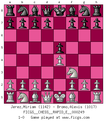 Last move : 1-0 2023 May 21 14:29:18 [Event "FICGS__CHESS__RAPID_E__000249"] [Site "FICGS"] [Date "2023.04.16"] [Round "1"] [White "Jerez,Miriam"] [Black "Bromo,Alexis"] [Result "1-0"] [WhiteElo "1142"] [BlackElo "1017"] 1.e4 e5 2.Nf3 1-0 This chess game has been lost on time (started : 2023.04.16 21:52:12) Follow this game move after move (download)I still hope to kill Fischer. (Boris Spassky) Die Arbeit ist etwas Unnatürliches. Die Faulheit allein ist göttlich. (Anatole France) Un Peón pasado aumenta su poder a medida de que el número de piezas en el tablero disminuye. (Capablanca) Botvinnik disait en comparant les échecs à la musique: Il existe une science dont le but est l'étude de l'acoustique et des sons. Mais il y a aussi un art qui se sert de l'océan des sons : c'est la musique. De toute évidence, il en est de même pour la pensée. La logique est l'étude des lois de la réflexion et les échecs reflètent, en tant qu'art, le côté logique de la réflexion, sous la forme d'images artistiques... Extrait de Fischer - Spassky, Reykjavik 1972 par Alexander & F. Wyndham (Ed. Solar), p 37. An expert is a man who has made all the mistakes which can be made in a very narrow field. (Niels Bohr)