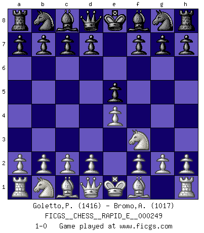 Last move : 1-0 2023 May 18 5:16:34 [Event "FICGS__CHESS__RAPID_E__000249"] [Site "FICGS"] [Date "2023.04.16"] [Round "1"] [White "Goletto,Piero Giuseppe"] [Black "Bromo,Alexis"] [Result "1-0"] [WhiteElo "1416"] [BlackElo "1017"] 1.e4 e5 2.Nf3 1-0 This chess game has been lost on time (started : 2023.04.16 21:52:12) Follow this game move after move (download)I thought the most common mistake [in chess] was the first one: Learning the game :P (Garvin Gray, FICGS forum) Als er Schachweltmeister wurde ließ er praktisch alle stärksten Sovietspieler für sich arbeiten. Wenn ein auch nur mittelmässiger Meister ein Spezialist für eine bestimmte Eröffnung war, wurde er von Karpov gerufen. Das wurde alles geheim gehalten. (Mikhail Moiseyevich Botvinik) El Ajedrez es un expediente tonto que hace creer a la gente inactiva que hacen una cosa muy astuta cuando solamente estan perdiendo su tiempo. (George Bernard Shaw) A chaque perte on perd un peu de soi. (Joël Lautier) Methinks King Thibault should dub Marius Zubac a knight of the square board... I mean table, henceforth addressing him as Sir Marius, and bestow on him a suitable land from the kingdom of FICGS & marry him off to a worthy, fair maiden, lest he slice our heads with his mighty sword in his wrath. (Dinesh De Silva)