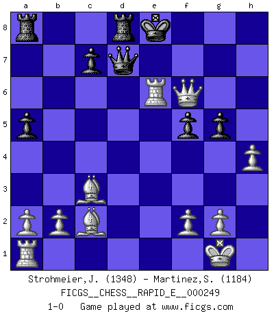 Last move : 1-0 2023 July 25 3:42:1 [Event "FICGS__CHESS__RAPID_E__000249"] [Site "FICGS"] [Date "2023.04.16"] [Round "1"] [White "Strohmeier,Josef"] [Black "Martinez,Silvio"] [Result "1-0"] [WhiteElo "1348"] [BlackElo "1184"] 1.e4 e5 2.Nf3 Nc6 3.Bb5 Nge7 4.O-O g6 5.d3 a6 6.Ba4 b5 7.Bb3 d5 8.exd5 Nxd5 9.Re1 Bg7 10.d4 O-O 11.dxe5 Be6 12.Bg5 Qd7 13.c3 h6 14.Bh4 g5 15.Bg3 a5 16.Bc2 Rfd8 17.Qd3 b4 18.Qh7+ Kf8 19.h4 Nxe5 20.Nxe5 Bxe5 21.Bxe5 bxc3 22.Nxc3 Nxc3 23.Bxc3 f5 24.Qxh6+ Ke7 25.Qf6+ Ke8 26.Rxe6+ 1-0 This chess game has been lost on time (started : 2023.04.16 21:52:12) Follow this game move after move (download)The defensive power of a pinned piece is only imaginary. (Aaron Nimzovich) Garry Kasparov war erst in der Großmeister-Organisation GMA, dann in der Profischach-Vereinigung PCA, zum Schluss kehrte er wieder in den Schoß der FIDE zurück. Aber gut, manche Leute sind flexibel (Viswanathan Anand) Repentinamente, me resultaba obvio en mi analisis que yo había pasado por alto lo que Fischer había visto en el tablero con la mas grande facilidad. (Mikhail Botvinnik) Je ne suis pas le dernier à jouer lâchement des coups douteux pendant le zeïtnot de l'adversaire pour l'achever: en effet les coups qui font le plus peur sont ceux que l'on ne comprend pas. Je me fais souvent peur quand je joue. (Un professeur anonyme) Life is like a game of cards: the hand you are dealt represents determinism; the way you play it is free will. (Jawaharlal Nehru)