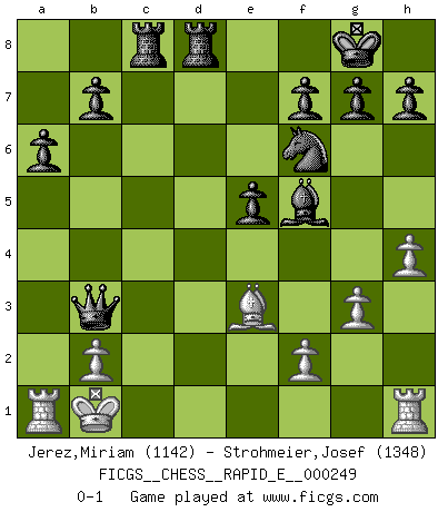 Last move : 0-1 2023 July 27 19:34:12 [Event "FICGS__CHESS__RAPID_E__000249"] [Site "FICGS"] [Date "2023.04.16"] [Round "1"] [White "Jerez,Miriam"] [Black "Strohmeier,Josef"] [Result "0-1"] [WhiteElo "1142"] [BlackElo "1348"] 1.e4 c5 2.d4 cxd4 3.Qxd4 Nc6 4.g3 Nxd4 5.Bd3 d6 6.Nc3 a6 7.Nd5 e6 8.Nb4 d5 9.Rb1 Qb6 10.c3 Bxb4 11.cxb4 Qxb4+ 12.Bd2 Qd6 13.Bf4 e5 14.Be3 Nf6 15.h4 O-O 16.Ne2 Nf3+ 17.Kd1 dxe4 18.Nc1 exd3 19.Ra1 Bg4 20.Nb3 Nd4 21.Kd2 Qb4+ 22.Kxd3 Nxb3 23.axb3 Qxb3+ 24.Kd2 Rfd8+ 25.Kc1 Rac8+ 26.Kb1 Bf5+ 0-1 This chess game has been lost on time (started : 2023.04.16 21:52:12) Follow this game move after move (download)I had a toothache during the first game. In the second game I had a headache. In the third game it was an attack of rheumatism. In the fourth game, I wasn't feeling well. And in the fifth game? Well, must one have to win every game ? (Siegbert Tarrasch) Wenn Du absolut nicht mehr weißt, was Du tun sollst, dann ist es Zeit für Panik. (John van der Wiel) ¿Porque tengo que perder ante este idiota?. (Aron Nimzovich) Horreur, mais aussi harmonie suprême : qu'y avait-il en effet au monde en dehors des échecs ? Le brouillard, l'inconnu, le non-être... (Vladimir Nabokov) True nature is revealed in times of difficulty. (Chinese proverb)