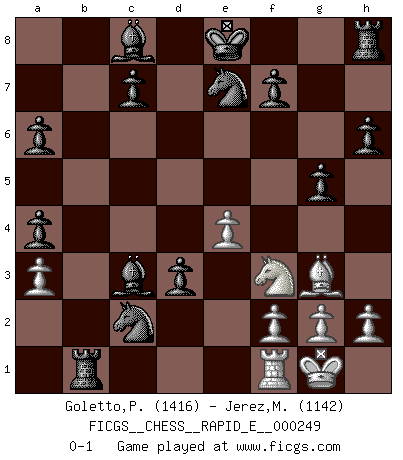 Last move : 0-1 2023 June 28 17:38:50 [Event "FICGS__CHESS__RAPID_E__000249"] [Site "FICGS"] [Date "2023.04.16"] [Round "1"] [White "Goletto,Piero Giuseppe"] [Black "Jerez,Miriam"] [Result "0-1"] [WhiteElo "1416"] [BlackElo "1142"] 1.e4 e5 2.Nf3 Nc6 3.Bb5 Nge7 4.O-O d5 5.Nc3 a6 6.Ba4 b5 7.d4 exd4 8.Bg5 h6 9.Bh4 dxc3 10.bxc3 bxa4 11.Rb1 g5 12.Bg3 Bg7 13.c4 dxc4 14.c3 Bxc3 15.Rc1 Qd3 16.Qxd3 cxd3 17.Rcd1 Nb4 18.a3 Nc2 19.Rc1 Rb8 20.Rb1 Rxb1 0-1 This chess game has been lost on time (started : 2023.04.16 21:52:12) Follow this game move after move (download)Some sacrifices are sound; the rest are mine. (Mikhail Tal) Ein Kibitz ist einer, der deinem Gegner gute Ratschläge gibt. (Andrew Soltis) El Ajedrez era la lengua materna de Capablanca. (Reti) Fischer est le meilleur joueur du monde et Karpov n'est qu'un joueur de bistrot. (Garry Kasparov, agé de 16 ans) The Internet is the world's largest library. It's just that all the books are on the floor. (John Allen Paulos)