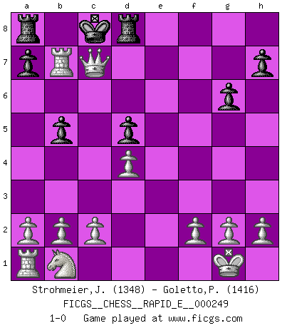 Last move : 1-0 2023 July 2 23:22:28 [Event "FICGS__CHESS__RAPID_E__000249"] [Site "FICGS"] [Date "2023.04.16"] [Round "1"] [White "Strohmeier,Josef"] [Black "Goletto,Piero Giuseppe"] [Result "1-0"] [WhiteElo "1348"] [BlackElo "1416"] 1.e4 e5 2.Nf3 Nc6 3.Bb5 Nd4 4.Nxd4 Nf6 5.Nf3 c6 6.Bc4 d5 7.exd5 cxd5 8.Bb5+ Bd7 9.Bxd7+ Kxd7 10.Nxe5+ Ke6 11.d4 Bd6 12.Qe2 Re8 13.O-O Bxe5 14.Qxe5+ Kd7 15.Qf5+ Ke7 16.Bg5 g6 17.Bxf6+ Kf8 18.Bxd8 Rexd8 19.Qe5 f6 20.Qxf6+ Ke8 21.Re1+ Kd7 22.Re7+ Kc8 23.Qf7 b5 24.Rc7+ Kb8 25.Rb7+ Kc8 26.Qc7+ 1-0 Follow this game move after move (download)Chess is a part of culture and if a culture is declining then Chess too will decline. (Mikhail Botvinnik) Unter Putin wird alles Geld aus Russland wie von einem Staubsauger nach Moskau umgeleitet, das ist wie ein schwarzes Loch. (Garry Kasparov) Cuando tengas duda... ¡juega al Ajedrez!. (Tevis) J'apprécie les joueurs d'est-indienne, c'est grâce à eux que je nourris ma famille depuis tant d'années. (Petrosian) Before all elsed, be armed. (Niccolo Machiavelli)