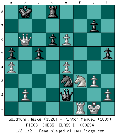 Last move : 1/2-1/2 2023 July 16 20:27:53 [Event "FICGS__CHESS__CLASS_D__000294"] [Site "FICGS"] [Date "2023.04.16"] [Round "1"] [White "Goldmund,Heike"] [Black "Pintor,Manuel"] [Result "1/2-1/2"] [WhiteElo "1526"] [BlackElo "1699"] 1.e4 e5 2.Nf3 Nc6 3.c3 Bc5 4.Bc4 Qf6 5.a4 a5 6.O-O d6 7.d3 Bg4 8.Be3 O-O-O 9.Nbd2 Nge7 10.Nb3 Bxe3 11.fxe3 b6 12.d4 Ng6 13.Bd5 Nce7 14.Bc4 Nh4 15.Nbd2 c5 16.Qc2 Nxf3+ 17.Nxf3 Qh6 18.Bxf7 Qxe3+ 19.Kh1 h5 20.Rae1 Qh6 21.Nh4 Qg5 22.g3 Rhf8 23.Qd3 exd4 24.cxd4 Nc6 25.Qa6+ Kc7 26.d5 Ne5 27.Qa7+ Kc8 28.Qa8+ Kc7 29.Qa7+ Kc8 30.Be6+ Bxe6 31.dxe6 Rxf1+ 32.Rxf1 Qd2 33.Qxb6 Ng4 34.Qc6+ Kb8 35.Nf3 Qe2 36.Qb6+ Kc8 37.Kg1 Ne3 38.Qc6+ Kb8 39.Qb6+ 1/2-1/2 Follow this game move after move (download)When you see a good move, look for a better one. (Emanuel Lasker) Mutter, ich bin eben Ex-Weltmeister geworden. --beim nach Hause Kommen nach dem Verlust des WM-Titels an Mihail Botvinnik -- (Mikhail Nekhemyevich Tal) El jugador táctico debe saber que hacer cuando algo se debe de hacer. El estratégico debe saber que hacer cuando nada se debe de hacer. (Savielly Tartakover) Une platitude souvent récitée à propos des Echecs est qu'une des choses les plus difficiles à réaliser est de gagner une position gagnante. Cela ne manque pas de sens mais, pour ma part, j'ai toujours trouvé plus difficile de gagner une position perdante. (Tim Krabbe) Have no fear of perfection - you'll never reach it. (Salvador Dali)