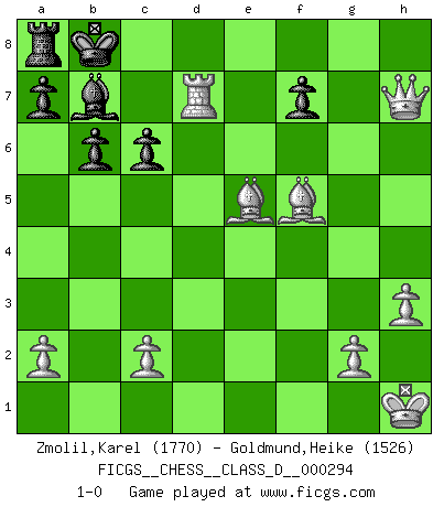 Last move : 1-0 2023 June 19 16:38:13 [Event "FICGS__CHESS__CLASS_D__000294"] [Site "FICGS"] [Date "2023.04.16"] [Round "1"] [White "Zmolil,Karel"] [Black "Goldmund,Heike"] [Result "1-0"] [WhiteElo "1770"] [BlackElo "1526"] 1.e4 d5 2.exd5 Qxd5 3.Nc3 Qa5 4.d3 Nf6 5.Bd2 c6 6.Be2 e6 7.Nf3 Qc7 8.h3 Bd6 9.Ne4 Nxe4 10.dxe4 Nd7 11.Bc3 Nc5 12.e5 Be7 13.O-O Ne4 14.Be1 Ng5 15.Nxg5 Bxg5 16.f4 Be7 17.Bd3 Qb6+ 18.Kh1 Qxb2 19.Bd2 Qb6 20.Qg4 O-O 21.Rf3 Rd8 22.Rg3 Bf8 23.Qh4 Qf2 24.Rxg7+ Bxg7 25.Qxf2 b6 26.Qh4 Bb7 27.Qxh7+ Kf8 28.f5 Bxe5 29.Bh6+ Ke7 30.fxe6 Kxe6 31.Bf5+ Ke7 32.Bg5+ Bf6 33.Re1+ Kd6 34.Bxf6 Rd7 35.Rd1+ Kc7 36.Rxd7+ Kb8 37.Be5+ 1-0 Follow this game move after move (download)Human affairs are like a Chess game: only those who do not take it seriously can be called good players. (Hung Tzu Ch'eng) Die unerbitterlichsten Regeln im Schach sind die Ausnahmen. (Savielly Grigorievitsch Tartakower) Una clavada es mas poderosa que una espada. (Fred Reinfeld) Tout change constamment, y compris dans le monde des Echecs. (Botvinnik) When you stop learning you start dying. (Scott Adams)