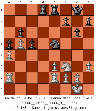 Last move : 1/2-1/2 2023 July 17 11:35:38 [Event "FICGS__CHESS__CLASS_D__000294"] [Site "FICGS"] [Date "2023.04.16"] [Round "1"] [White "Goldmund,Heike"] [Black "Bernardara,Enos"] [Result "1/2-1/2"] [WhiteElo "1526"] [BlackElo "1640"] 1.b4 a5 2.b5 Nf6 3.e3 c5 4.c4 d6 5.Nf3 g6 6.Bb2 Bg7 7.d3 O-O 8.a4 b6 9.Be2 Bb7 10.Nbd2 Nbd7 11.O-O Re8 12.Ng5 e5 13.Bf3 Bxf3 14.Ngxf3 Qe7 15.Re1 Nh5 16.Ne4 Ndf6 17.Nxf6+ Nxf6 18.Qd2 Rad8 19.h3 e4 20.dxe4 Nxe4 21.Qc2 d5 22.Bxg7 Kxg7 23.Qb2+ Kg8 24.Qc2 dxc4 25.Qxc4 Nd6 26.Qc3 Qe4 27.Ng5 Qc4 28.Qxc4 Nxc4 29.Ra2 Nd2 30.Re2 Nc4 31.Nf3 Ne5 1/2-1/2 Follow this game move after move (download)Every Chess master was once a beginner. (Chernev) Sie bekommen vielleicht den Eindruck, dass die Spitzenspieler überhaupt gar nicht so stark sind. Aber das stimmt nicht. Es ist eine Illusion. Mit einem Computer an der Seite ist es sehr leicht, Urteile zu fällen, aber wenn man alleine am Brett sitzt, sieht die Sache ganz anders aus. (Vladimir Kramnik) El Ajedrez es realmente noventa y nueve por ciento calculación. (Soltis) La conception d'un plan est le processus par lequel un joueur exploite les avantages de sa position tout en s'efforçant d'en réduire au minimum les inconvénients. Afin de garantir le succès, un plan doit toujours se fonder sur un diagnostic objectif des particularités d'une position. La conception d'un plan est d'autant plus difficile que la position est équilibrée, et grandement facilitée lorsqu'il n'existe qu'un seul plan susceptible de répondre aux exigences de la position. (Harry Golombek) The real danger is not that computers will begin to think like men, but that men will begin to think like computers. (Sydney J. Harris)