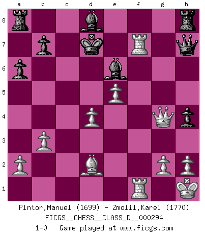 Last move : 1-0 2023 April 28 8:13:47 [Event "FICGS__CHESS__CLASS_D__000294"] [Site "FICGS"] [Date "2023.04.16"] [Round "1"] [White "Pintor,Manuel"] [Black "Zmolil,Karel"] [Result "1-0"] [WhiteElo "1699"] [BlackElo "1770"] 1.e4 c6 2.f4 d6 3.Nf3 Nd7 4.Bc4 h6 5.d4 e6 6.O-O d5 7.exd5 cxd5 8.Bd3 Ngf6 9.Ne5 a6 10.Nc3 Qb6 11.Ne2 Bd6 12.Kh1 Bc7 13.c3 Qd6 14.Ng3 Qe7 15.Nh5 Qf8 16.Bg6 Nxe5 17.fxe5 fxg6 18.Nxf6+ gxf6 19.Rxf6 Qg7 20.Qg4 g5 21.Qh5+ Ke7 22.Bd2 Bd7 23.Raf1 Be8 24.Qh3 g4 25.Qh4 Kd7 26.Qg3 Bd8 27.R6f2 h5 28.b3 Bg6 29.c4 h4 30.Qxg4 Qh7 31.cxd5 Bf5 32.dxe6+ Bxe6 33.Rf7+ 1-0 Follow this game move after move (download)The mistakes are there, waiting to be made. (Savielly Tartakower) Kein Schachspieler kann gut schlafen. (H. G. Wells) El Ajedrez es en su esencia, un juego. En su forma, un arte. Y en su ejecución, una ciencia. (Baron Tassilo) La tactique, c'est ce que vous faites quand il y a quelque chose à faire; la stratégie, c'est ce que vous faites quand il n'y a rien à faire. (Savielli Tartacower) The greatest con, that he ever pulled... was making you believe... that he is you. (Revolver, movie)