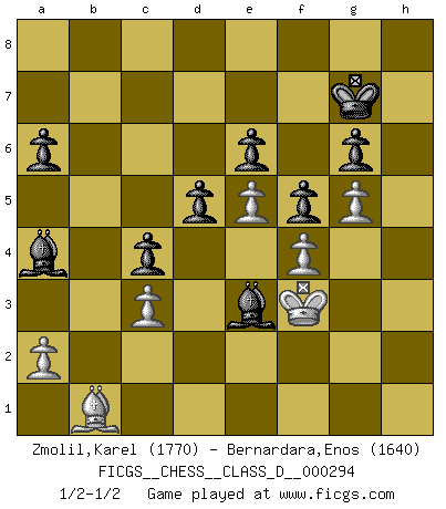 Last move : 1/2-1/2 2023 May 31 18:47:40 [Event "FICGS__CHESS__CLASS_D__000294"] [Site "FICGS"] [Date "2023.04.16"] [Round "1"] [White "Zmolil,Karel"] [Black "Bernardara,Enos"] [Result "1/2-1/2"] [WhiteElo "1770"] [BlackElo "1640"] 1.e4 c5 2.Nf3 Nc6 3.d4 cxd4 4.Nxd4 a6 5.c3 e6 6.Be3 Nf6 7.Nxc6 bxc6 8.f3 d5 9.e5 Nd7 10.f4 Be7 11.Bd3 O-O 12.O-O f6 13.Qg4 f5 14.Qh3 Nc5 15.Bc2 Ne4 16.Nd2 Nxd2 17.Bxd2 Qb6+ 18.Kh1 Qxb2 19.Rfc1 Qa3 20.g4 c5 21.Rcb1 c4 22.Qf3 Bd7 23.g5 g6 24.Qd1 Rfd8 25.Qc1 Qxc1+ 26.Bxc1 Rab8 27.Rxb8 Rxb8 28.Rb1 Rxb1 29.Bxb1 Ba4 30.Kg2 Kg7 31.Kf3 h6 32.h4 hxg5 33.hxg5 Bc5 34.Be3 Bxe3 1/2-1/2 Follow this game move after move (download)Any material change in a position must come about by mate, a capture, or a Pawn promotion. (Purdy) Ich verstehe mehr vom Schach als irgendein anderer lebender Meister. (José Raúl Capablanca) El jugador de combinación piensa hacia adelante; comienza de la posición dada y trabaja las movidas contundentes en su mente. (Emanuel Lasker) Botvinnik disait en comparant les échecs à la musique: Il existe une science dont le but est l'étude de l'acoustique et des sons. Mais il y a aussi un art qui se sert de l'océan des sons : c'est la musique. De toute évidence, il en est de même pour la pensée. La logique est l'étude des lois de la réflexion et les échecs reflètent, en tant qu'art, le côté logique de la réflexion, sous la forme d'images artistiques... Extrait de Fischer - Spassky, Reykjavik 1972 par Alexander & F. Wyndham (Ed. Solar), p 37. The beginning is the most important part of the work. (Plato)