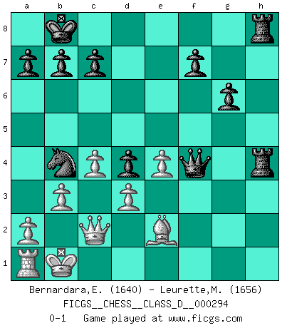 Last move : 0-1 2023 June 17 22:50:46 [Event "FICGS__CHESS__CLASS_D__000294"] [Site "FICGS"] [Date "2023.04.16"] [Round "1"] [White "Bernardara,Enos"] [Black "Leurette,Marc-Antoine"] [Result "0-1"] [WhiteElo "1640"] [BlackElo "1656"] 1.Nf3 d5 2.c4 d4 3.b3 Nc6 4.d3 e5 5.Bb2 Bb4+ 6.Nbd2 Bg4 7.h3 Bxf3 8.exf3 Nf6 9.Be2 Qe7 10.O-O O-O-O 11.Ne4 h5 12.g4 Nxe4 13.fxe4 g6 14.f4 Qh4 15.Kh2 exf4 16.Rxf4 Bd6 17.Bc1 Bxf4+ 18.Kg1 Qg3+ 19.Kf1 Qxh3+ 20.Ke1 Kb8 21.Bxf4 Qh4+ 22.Kd2 hxg4 23.Bxg4 Qf2+ 24.Kc1 Qxf4+ 25.Kb1 Rh4 26.Be2 Rdh8 27.Qc2 Nb4 0-1 Follow this game move after move (download)Daring ideas are like Chess men moved forward. They may be beaten, but they may start a winning game. (Johann Wolfgang von Goethe) Jede Eröffnung ist gut genug um gespielt zu werden, wenn nur ihr Ruf schlecht genug ist. (Savielly Grigorievitsch Tartakower) El Ajedrez es parte de la cultura, y si una cultura esta en decadencia, entonces también el Ajedrez declinará. (Mikhail Botvinnik) Je ne suis pas le dernier à jouer lâchement des coups douteux pendant le zeïtnot de l'adversaire pour l'achever: en effet les coups qui font le plus peur sont ceux que l'on ne comprend pas. Je me fais souvent peur quand je joue. (Un professeur anonyme) Chess is everything: art, science and sport. (Anatoly Karpov)