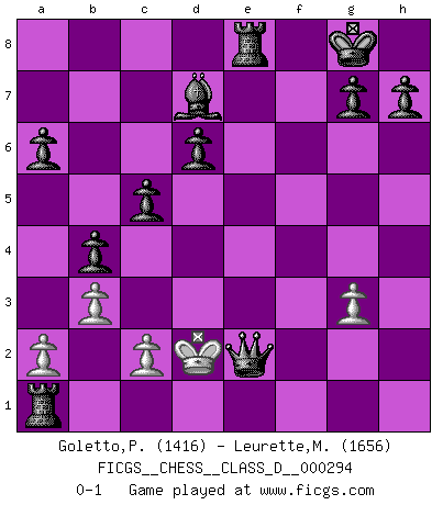 Last move : 0-1 2023 May 7 22:8:25 [Event "FICGS__CHESS__CLASS_D__000294"] [Site "FICGS"] [Date "2023.04.16"] [Round "1"] [White "Goletto,Piero Giuseppe"] [Black "Leurette,Marc-Antoine"] [Result "0-1"] [WhiteElo "1416"] [BlackElo "1656"] 1.e4 e5 2.Nf3 Nc6 3.Bb5 Nf6 4.O-O d6 5.Nc3 Bd7 6.d3 a6 7.Ba4 Be7 8.Be3 b5 9.Bb3 Na5 10.Bxf7+ Kxf7 11.d4 exd4 12.Bxd4 c5 13.Be3 Nc4 14.b3 Nxe3 15.fxe3 b4 16.Ne2 Re8 17.Nf4 Nxe4 18.Ne2 Kg8 19.Nd2 Bf6 20.Nxe4 Bxa1 21.Qxa1 Rxe4 22.Ng3 Rxe3 23.Re1 Rxe1+ 24.Kf2 Rxa1 25.Ne2 Qh4+ 26.g3 Qxh2+ 27.Ke3 Re8+ 28.Kd2 Qxe2+ 0-1 Follow this game move after move (download)The combination player thinks forward; he starts from the given position, and tries the forceful moves in his mind. (Emanuel Lasker) Verschiedene, sehr schätzbare und im Laufe des Lebens nützliche Eigenschaften des Geistes können durch das Schachspiel erworben und gekräftigt werden, so dass sie zu Gewohnheiten werden, die uns nie im Stich lassen. (Benjamin Franklin) Cuando tu no sabes absolutamente que mas hacer, es tiempo de entrar en pánico. (John van der Wiel) Les échecs sont utiles à l'exercice de la faculté de penser et à celle de l'imagination. Car nous devons posséder une méthode élaborée pour atteindre des buts partout où nous devons conduire notre raison. (Leibnitz) Never was anything great achieved without danger. (Niccolo Machiavelli)