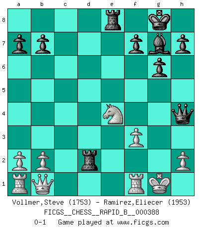 Last move : 0-1 2023 July 8 11:49:26 [Event "FICGS__CHESS__RAPID_B__000388"] [Site "FICGS"] [Date "2023.04.20"] [Round "1"] [White "Vollmer,Steve"] [Black "Ramirez,Eliecer"] [Result "0-1"] [WhiteElo "1753"] [BlackElo "1953"] 1.c4 g6 2.d4 Nf6 3.f3 d5 4.e3 e6 5.Bd3 Bg7 6.Ne2 c5 7.O-O O-O 8.Nbc3 Qe7 9.cxd5 cxd4 10.exd4 Nxd5 11.Nxd5 exd5 12.Qb3 Nc6 13.Qxd5 Bf5 14.Qc4 Bxd3 15.Qxd3 Rfe8 16.Nc3 Nxd4 17.Bd2 Rad8 18.Qb1 Nxf3+ 19.gxf3 Rxd2 20.Ne4 Qh4 0-1 Follow this game move after move (download)It began to feel as though you were playing against Chess itself. - On playing against Robert Fischer. (Walter Shipman) Ein typischer, sehr verbreiteter Gedankenschädling ist der, daß der betreffende Amateur von der Annanhme ausgeht, daß jeder einzelne Zug etwas zu leisten habe. (Aaron Nimzowitsch) Cuando tu casa esta en llamas, no puedes ser molestado por tus vecinos. O, como decinos en Ajedrez, si tu Rey esta bajo ataque, no te preocupa perder un Peón del lado de la Reina. (Gary Kasparov) Il s'avisa de me proposer d'apprendre les échecs qu'il jouait un peu... me voilà forcené des échecs. J'achète un échiquier, je m'enferme dans ma chambre, j'y passe des jours et des nuits à vouloir apprendre par cur toutes les parties. (Jean-Jacques Rousseau, Confessions) The meaning of life is that it is to be lived, and it is not to be traded and conceptualized and squeezed into a pattern of systems. (Bruce Lee)